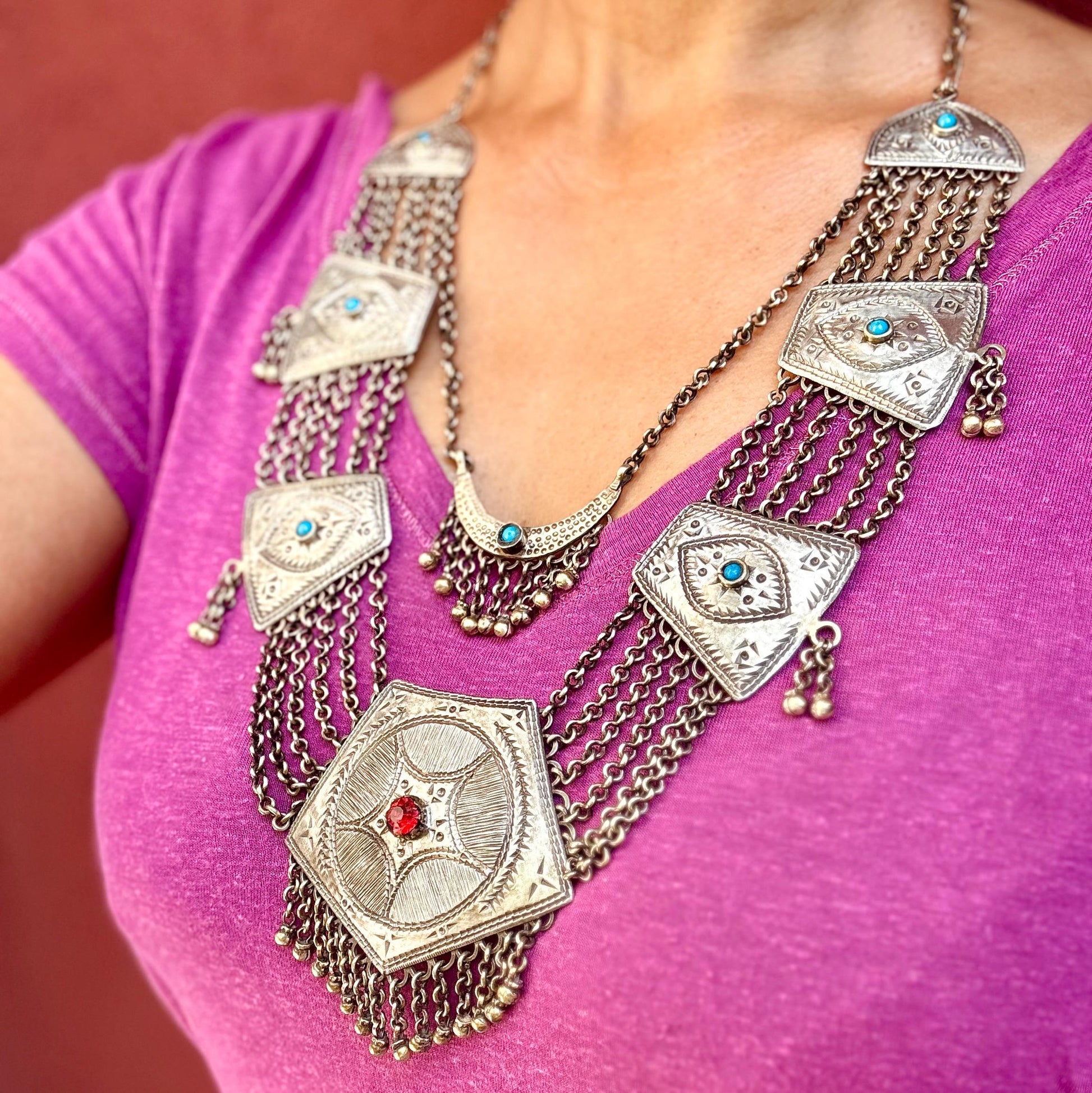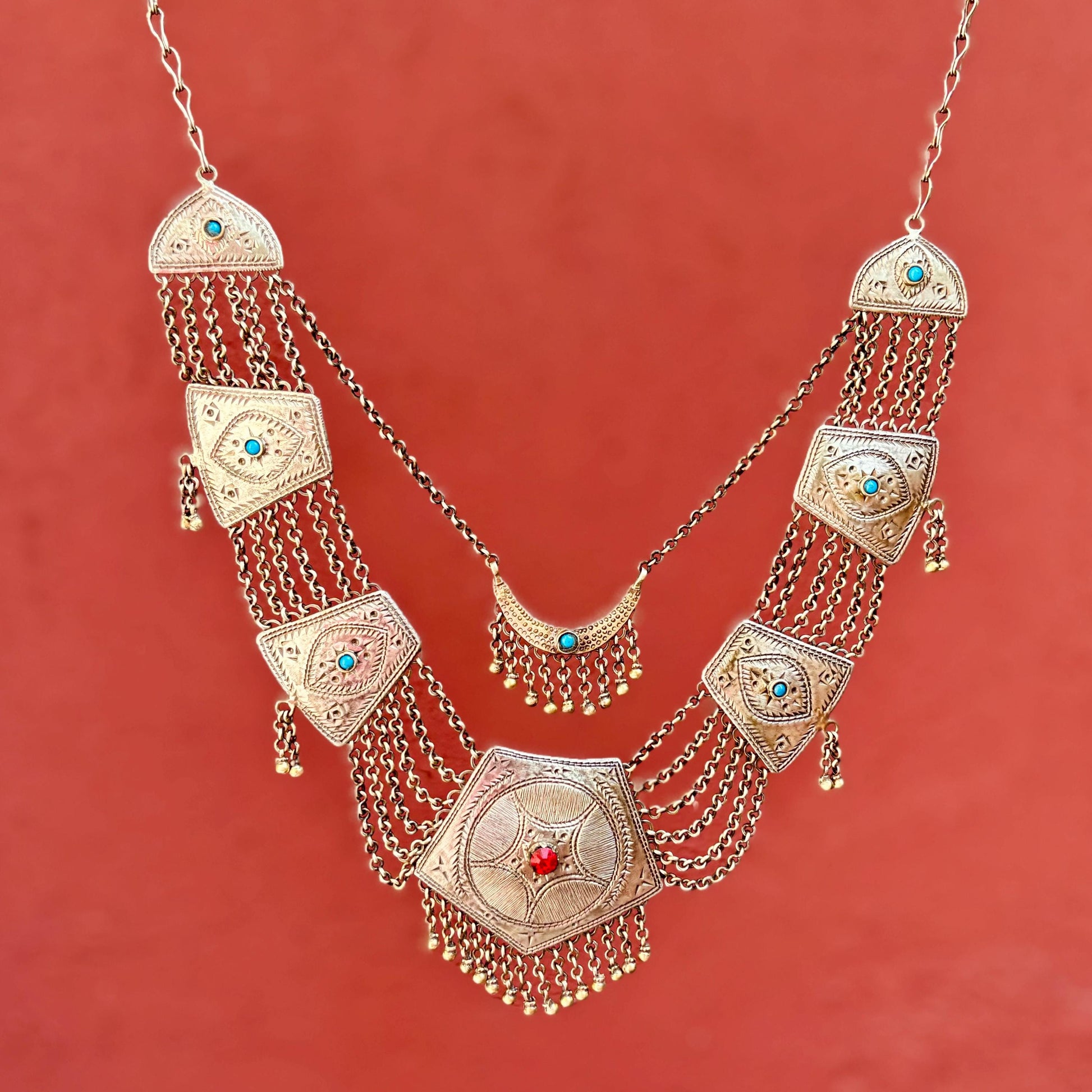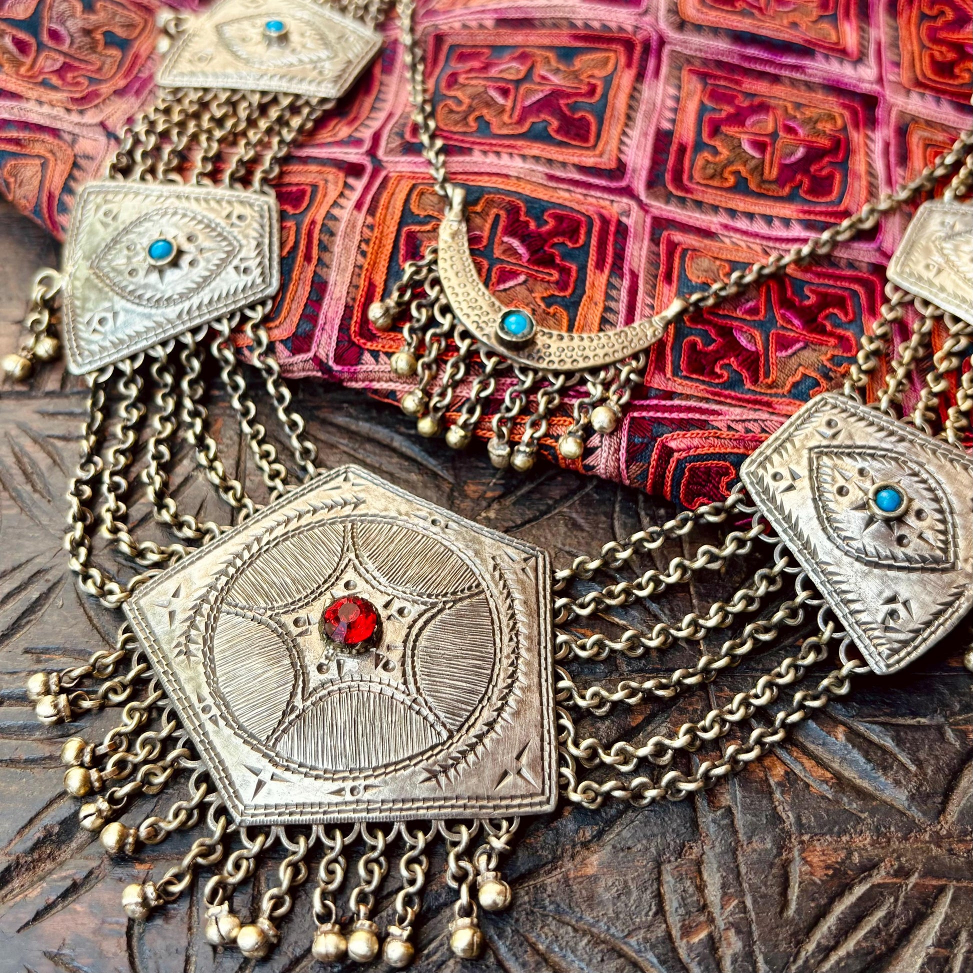 Traditionell bei Zeremonien und Festen getragen, symbolisierten diese Plastron-Halsketten Reichtum und sozialen Status. Jedes Stück erzählt eine Geschichte, die von den Seidenstraßen, Karawanen und kulturellen Austausch handelt, die die einzigartige Identität Kaschmirs geprägt haben. Dieses Schmuckstück zu tragen, bedeutet, eine jahrtausendealte Tradition fortzuführen und die asiatische Stammeskunst zu feiern.
