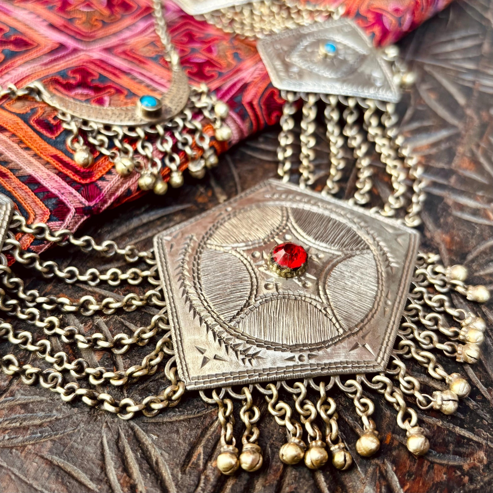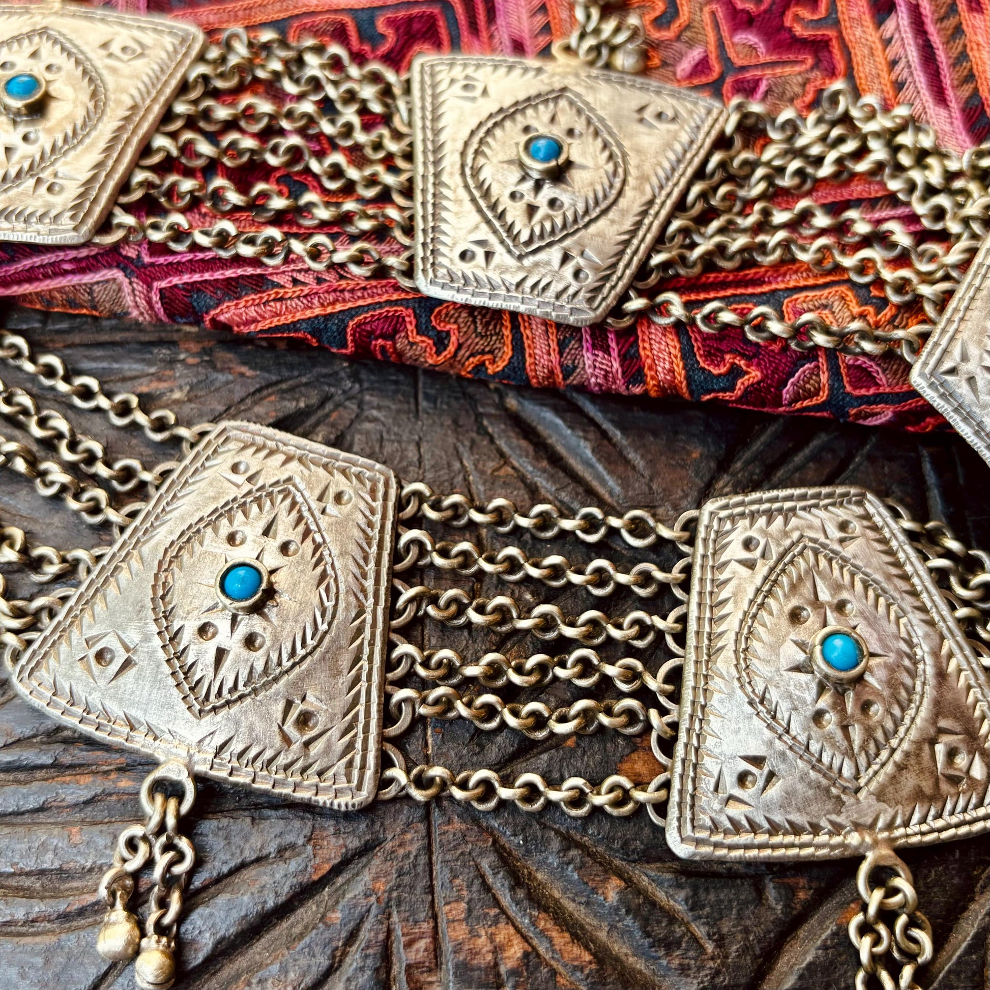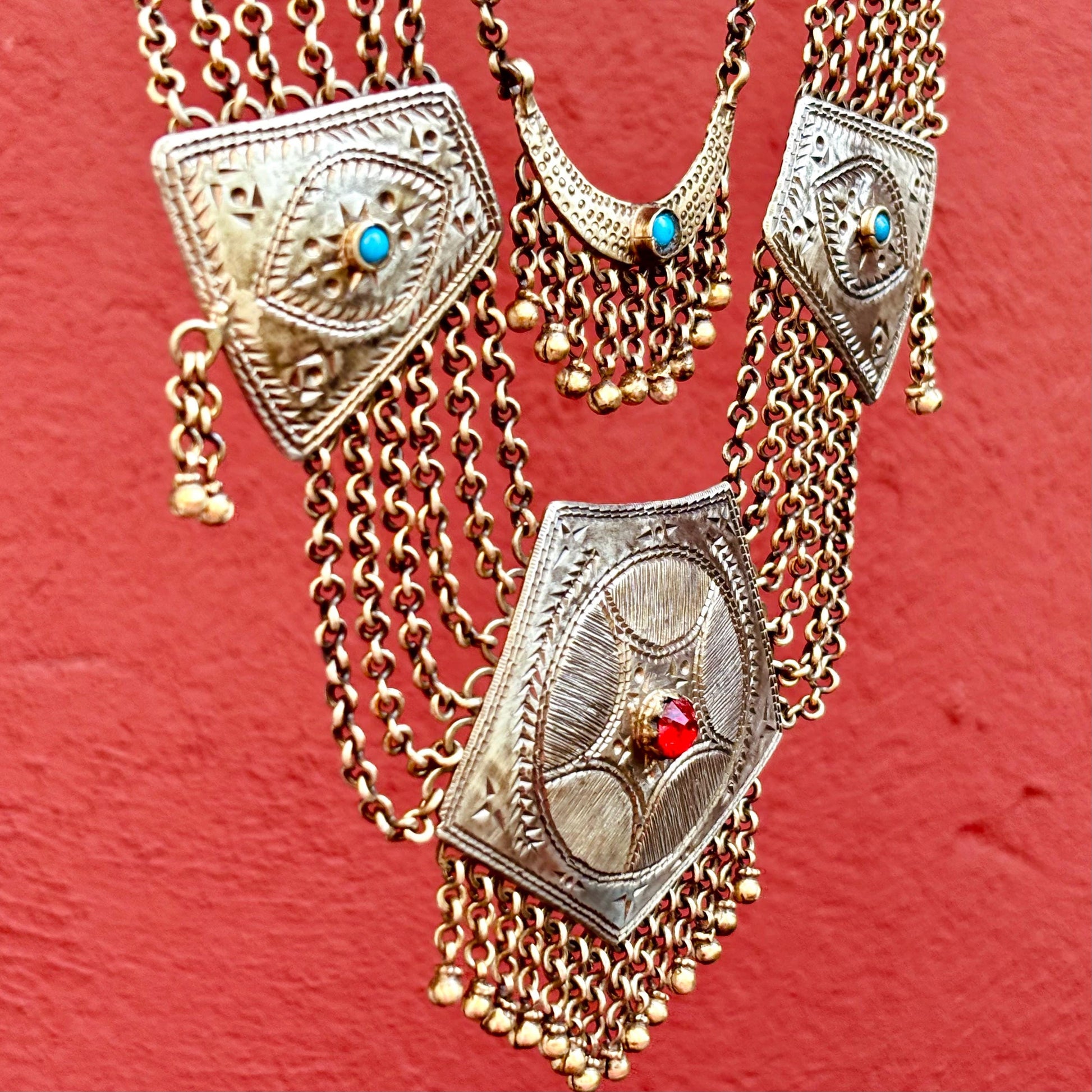Traditionell bei Zeremonien und Festen getragen, symbolisierten diese Plastron-Halsketten Reichtum und sozialen Status. Jedes Stück erzählt eine Geschichte, die von den Seidenstraßen, Karawanen und kulturellen Austausch handelt, die die einzigartige Identität Kaschmirs geprägt haben. Dieses Schmuckstück zu tragen, bedeutet, eine jahrtausendealte Tradition fortzuführen und die asiatische Stammeskunst zu feiern.