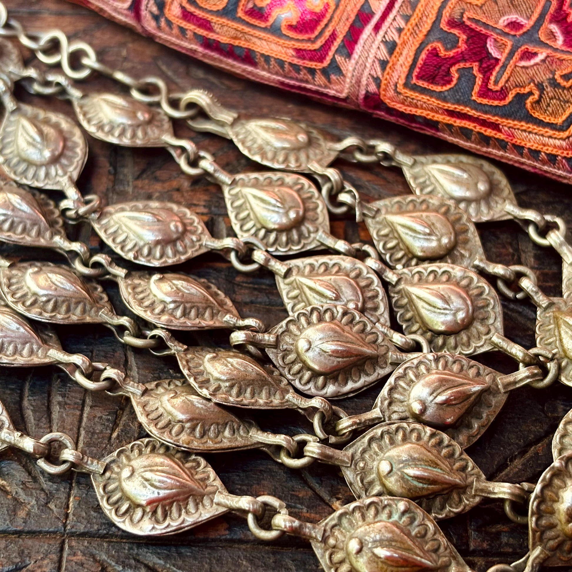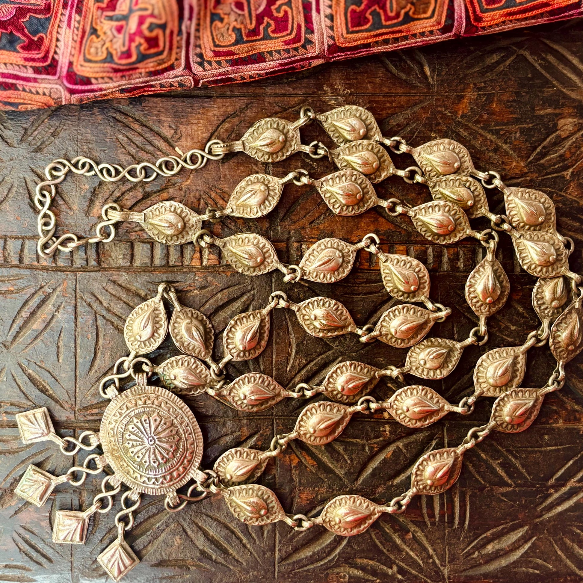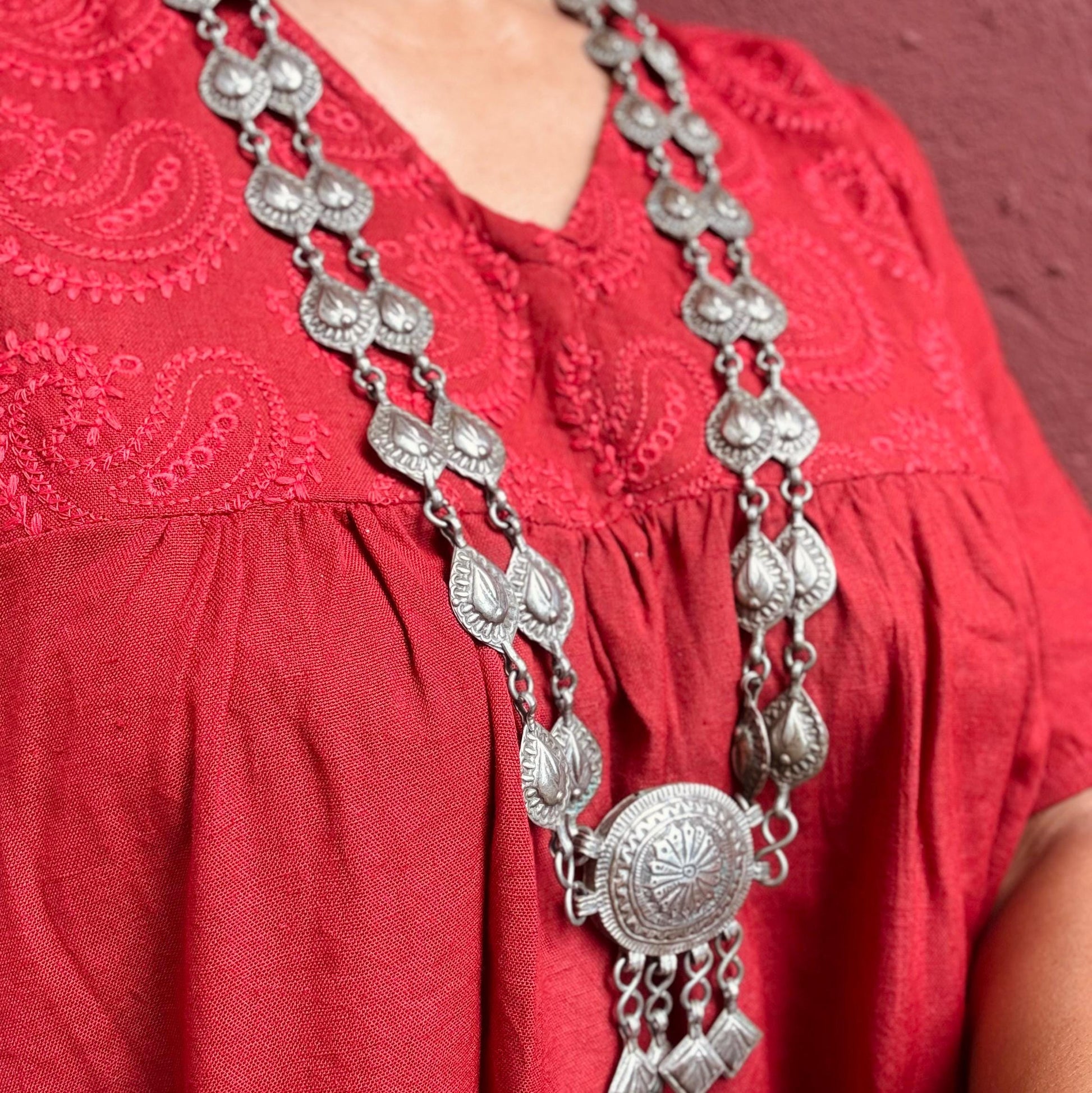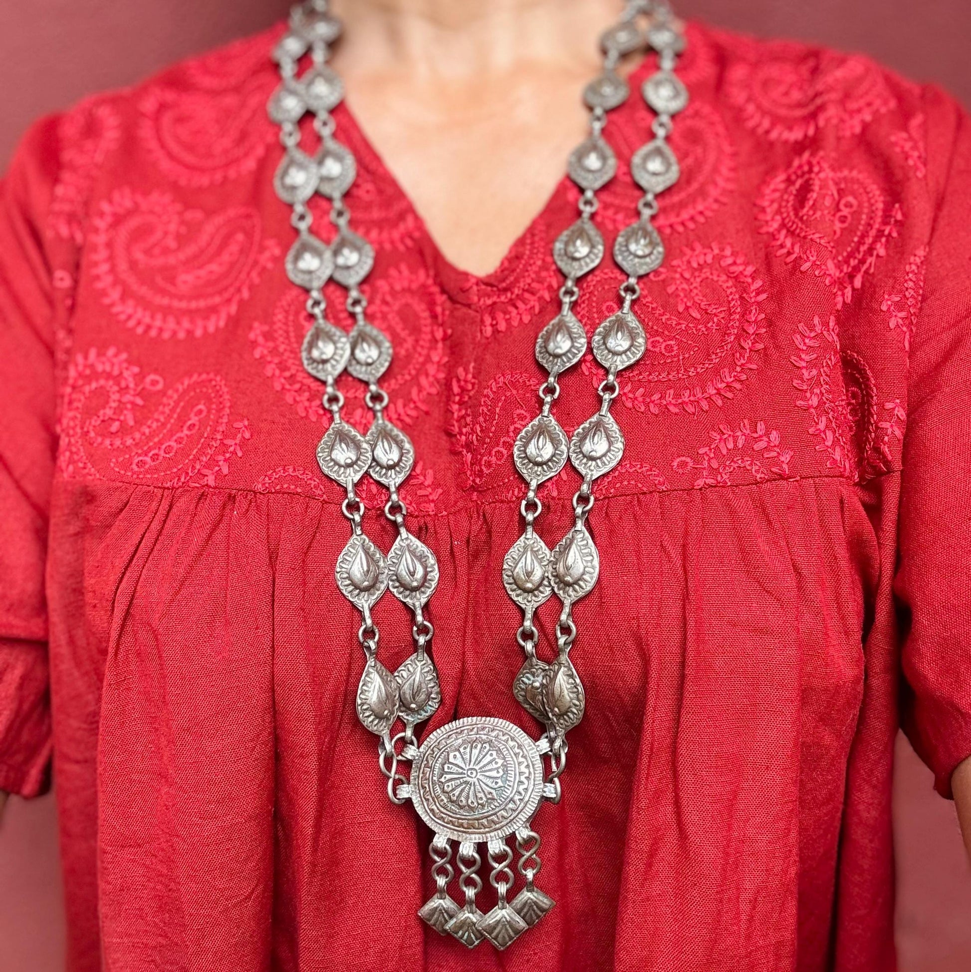Collar largo doble hilera estilo boho tribal, collar antiguo de metal de Cachemira, India, vintage, tribal, collar étnico oriental hippie asiático para festivales.