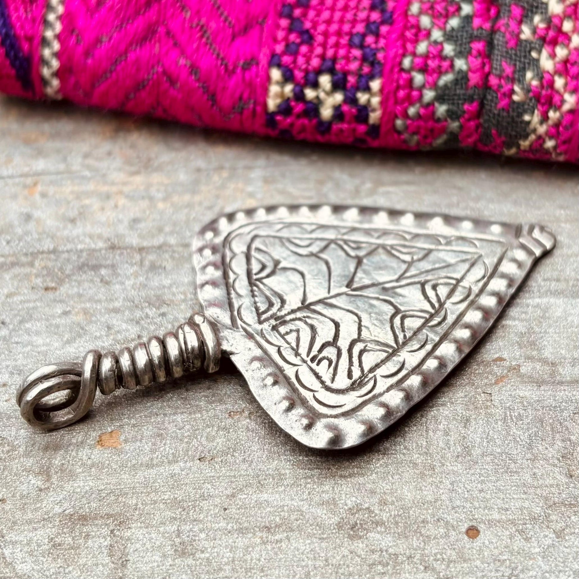 Pendentif ethnique argent pointu, Bijoux Afghans Hazara ethniques anciens, Bijoux Asie tribus nomades, Pendentif gravé boho tribal vintage