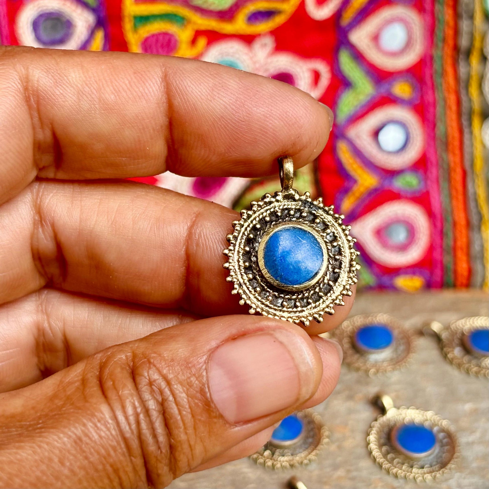 3 charms ronds lapis, Petit pendentif pierre bleue vintage ethnique afghan, Bijou tribu Kuchi tribal fusion, Création Fabrication de bijoux