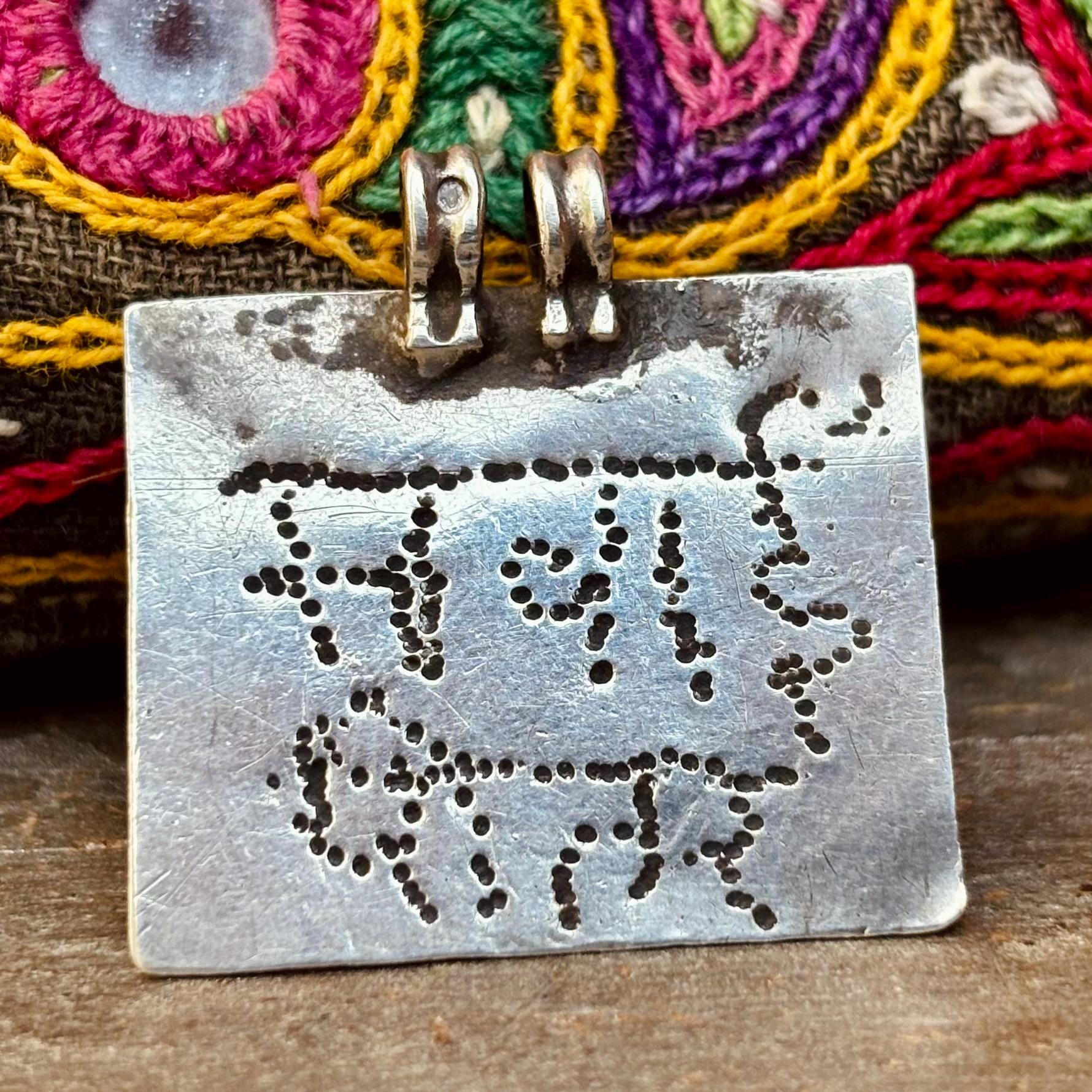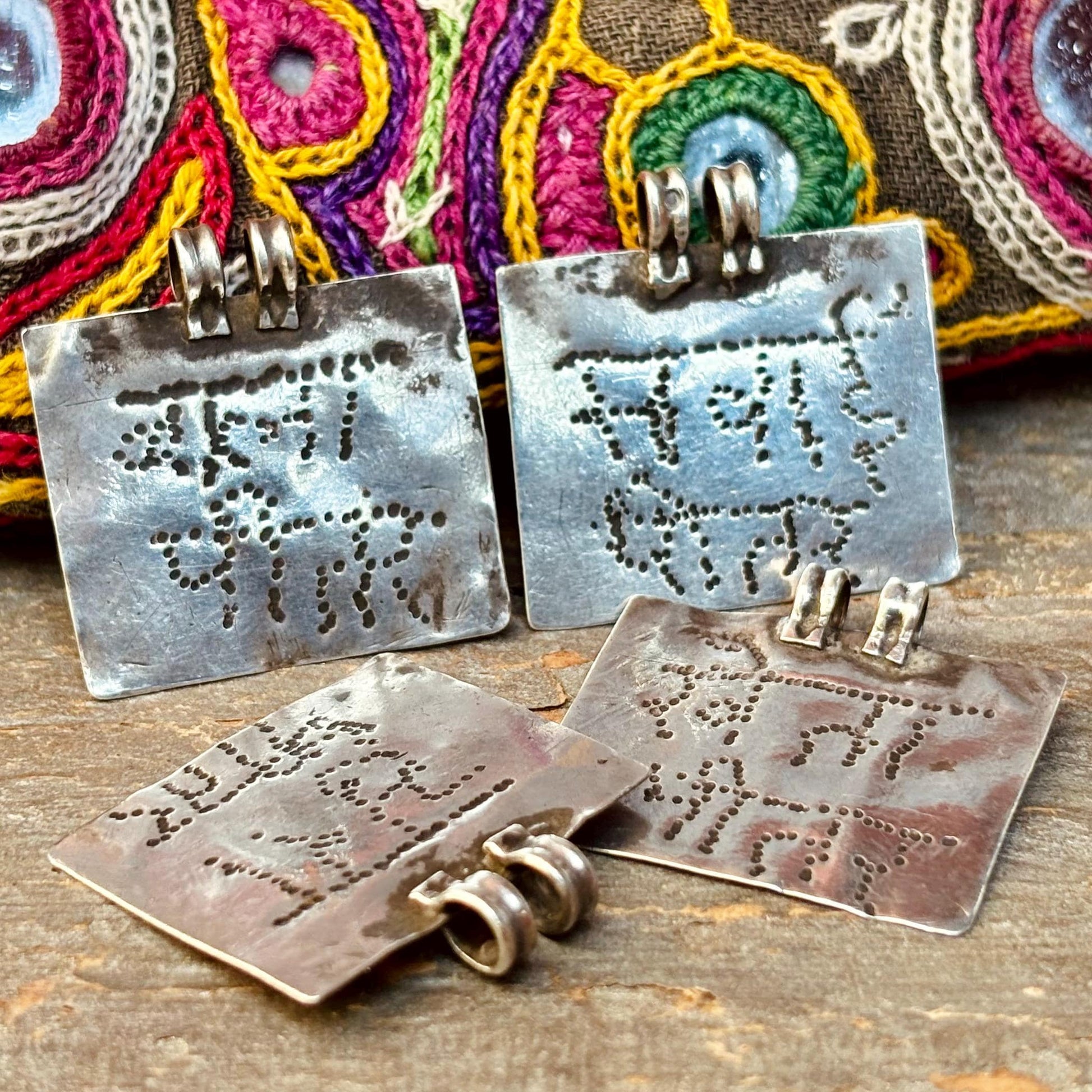 4 pendentifs tribaux ethniques Inde Rajasthan, Amulette rectangulaire ancien argent hindou mantra Rama, Bijou boho oriental vintage Asie