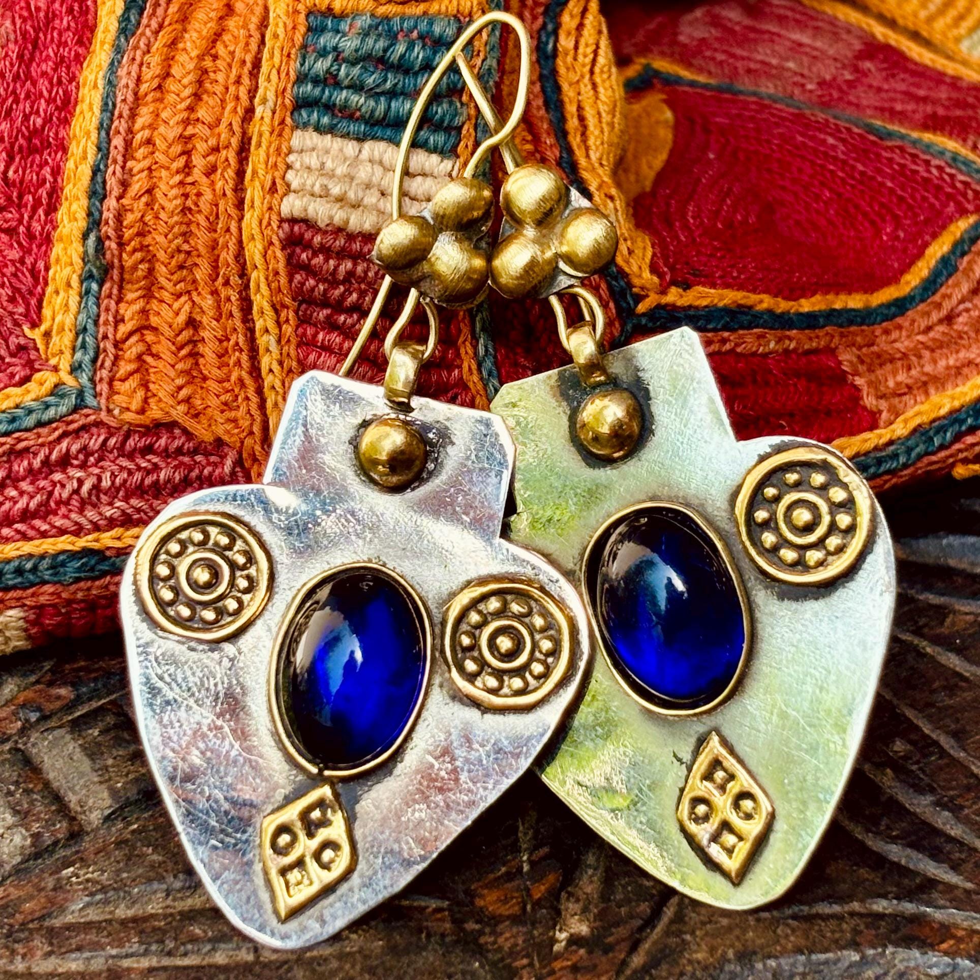 Le verre bleu foncé renforce la dimension protectrice de ces boucles. Dans les traditions d'Asie centrale, le bleu éloigne le mauvais œil et apporte paix intérieure et sagesse. L'association du métal argenté (lune, féminité) et doré (soleil, vitalité) crée un équilibre énergétique harmonieux. Ce bijou n'est pas une pièce ancienne, mais le fruit du travail d'artisans contemporains qui perpétuent les techniques traditionnelles Yomud avec passion et authenticité. Chaque pièce est façonnée à la main dans le respect des méthodes ancestrales, garantissant un bijou unique porteur d'histoire et de culture.
