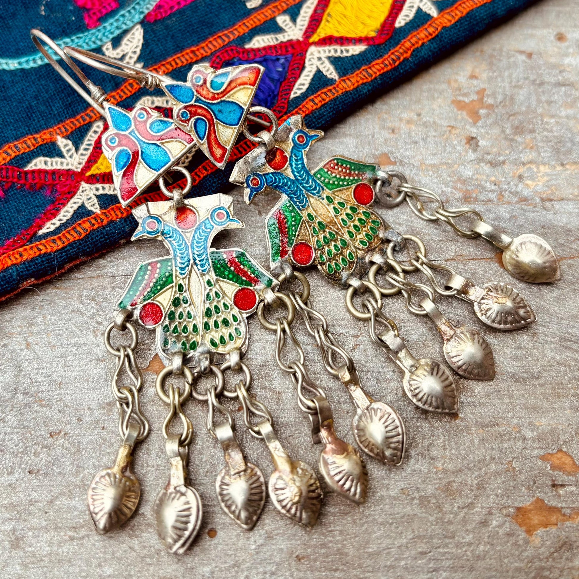 Boucles d’oreille émaillées orientales, Paons,Bijou tribal ethnique, asiatique, Vintage Rétro Afghan, Costume tribal, Artisanat Afghanistan