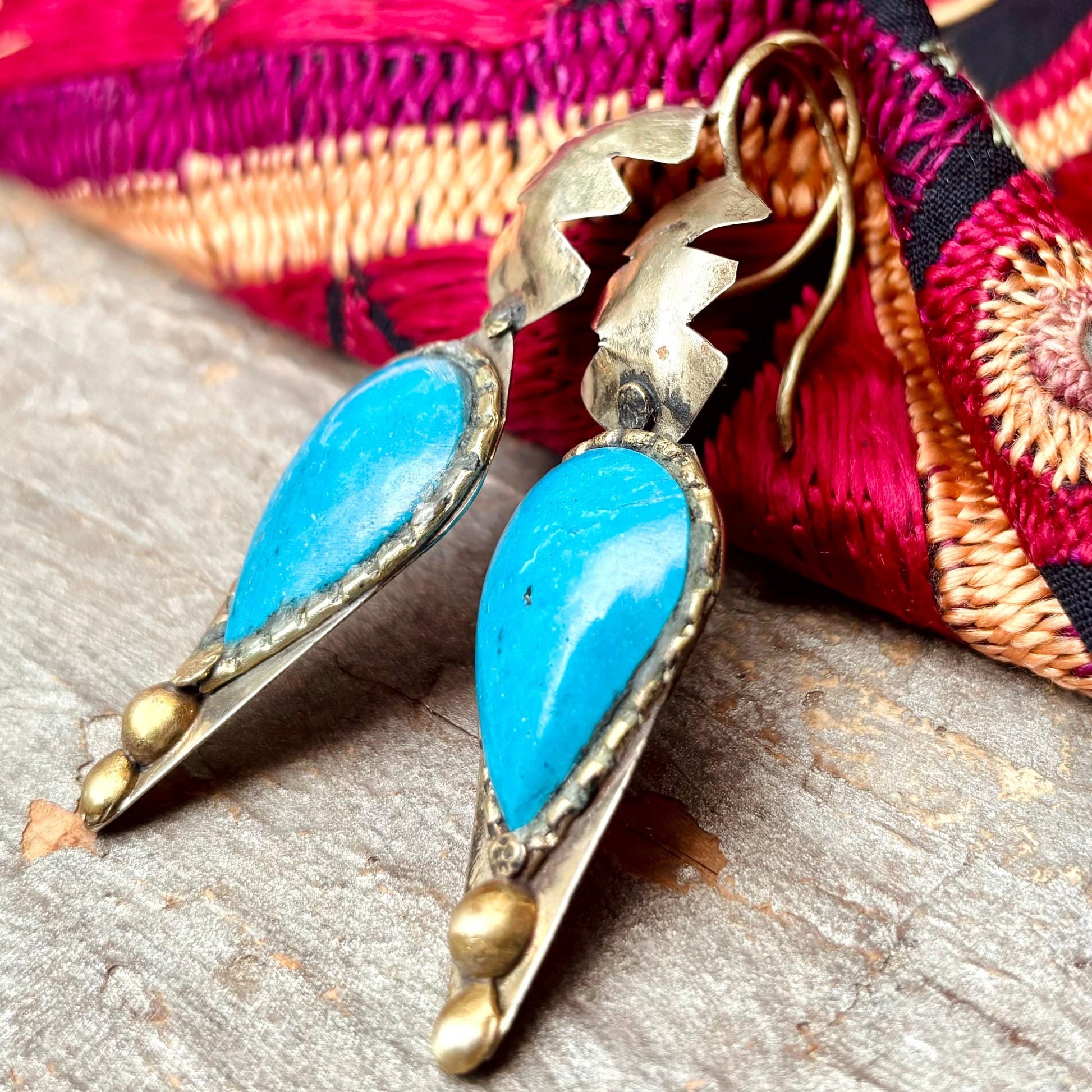 Boucles d’oreille turquoise argenté, Style boho oriental asiatique, Boucles d'oreille rigide tribal pierre bleue Inde, Bijou ethnique bohème