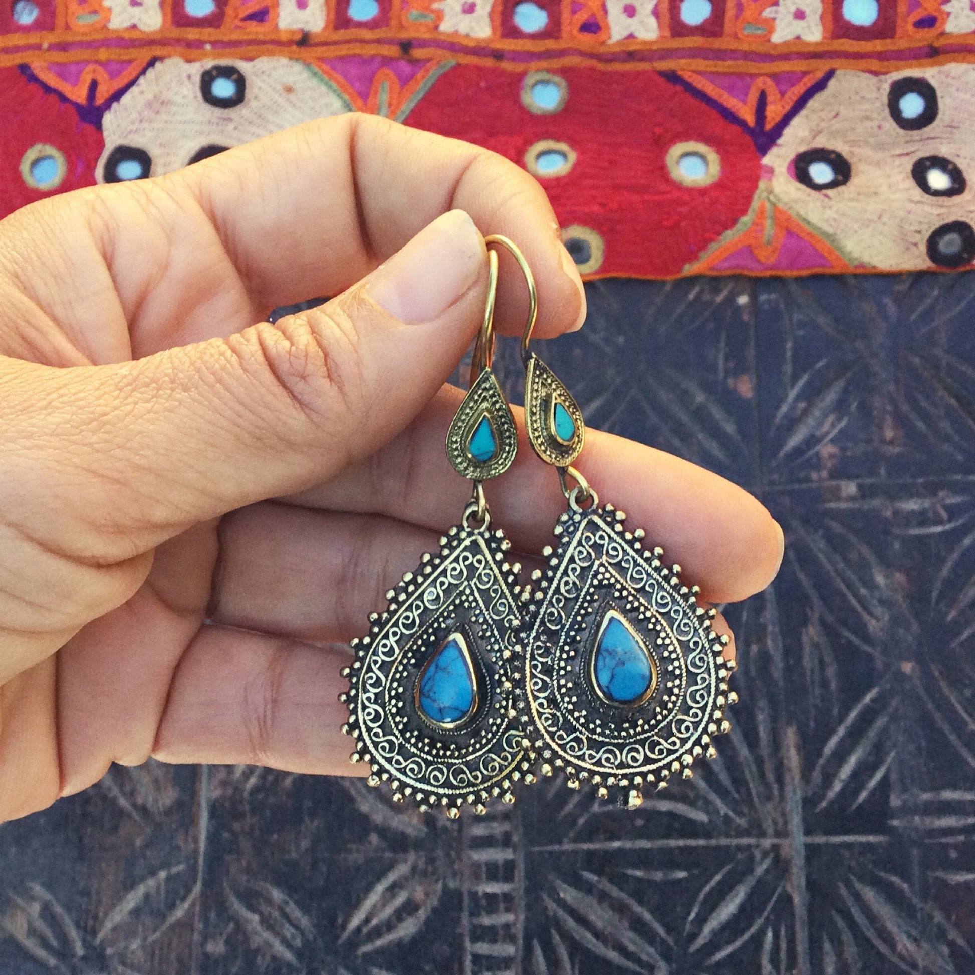 Boucles d’oreille turquoise, Boucles ethniques, tribales, orientales, Boucles d’oreille gypsy boho, Bijoux ethniques, Bijoux afghans, Cadeau
