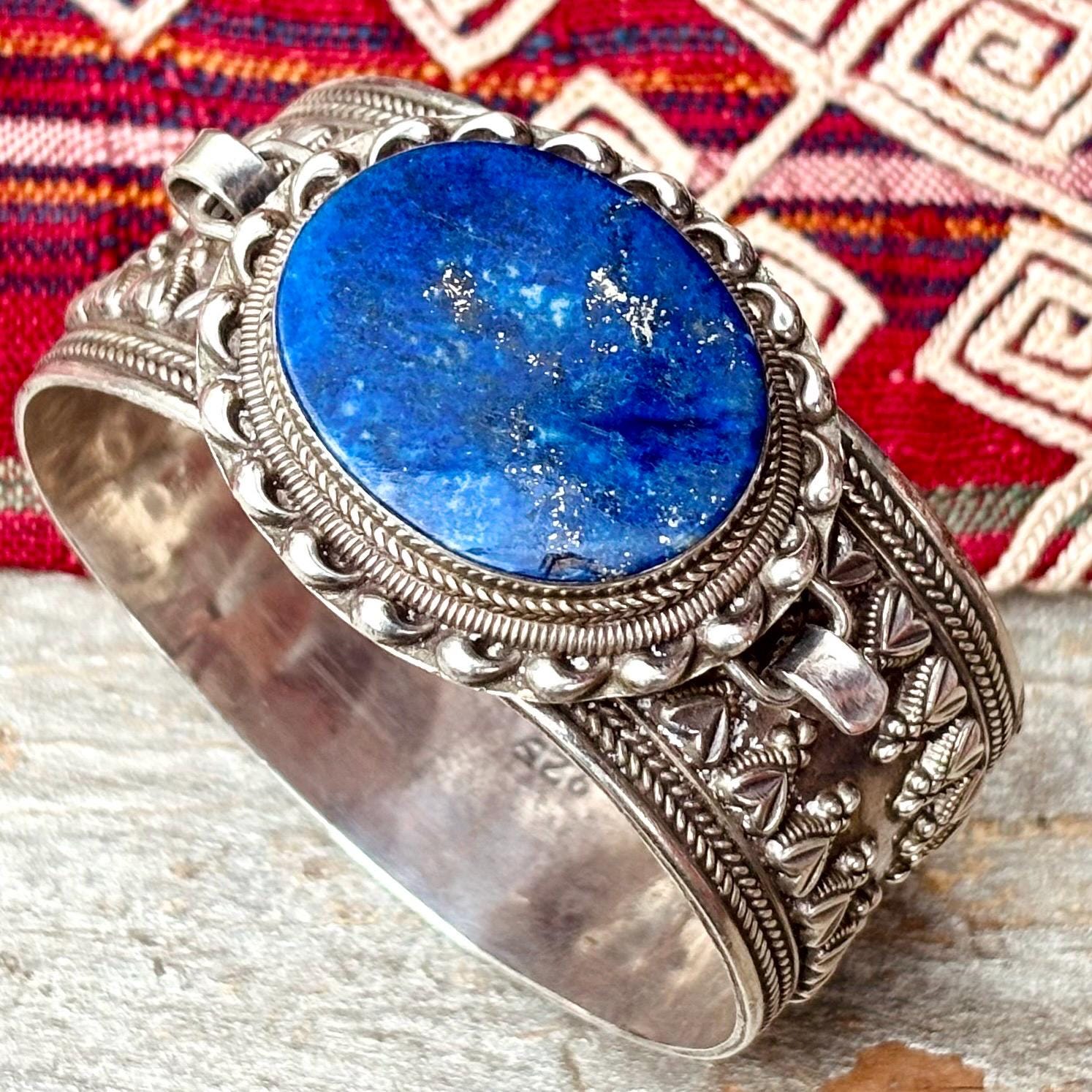 Bracelet argent sterling lapis-lazuli - Manchette ethnique vintage orientale boho indien Rajasthan