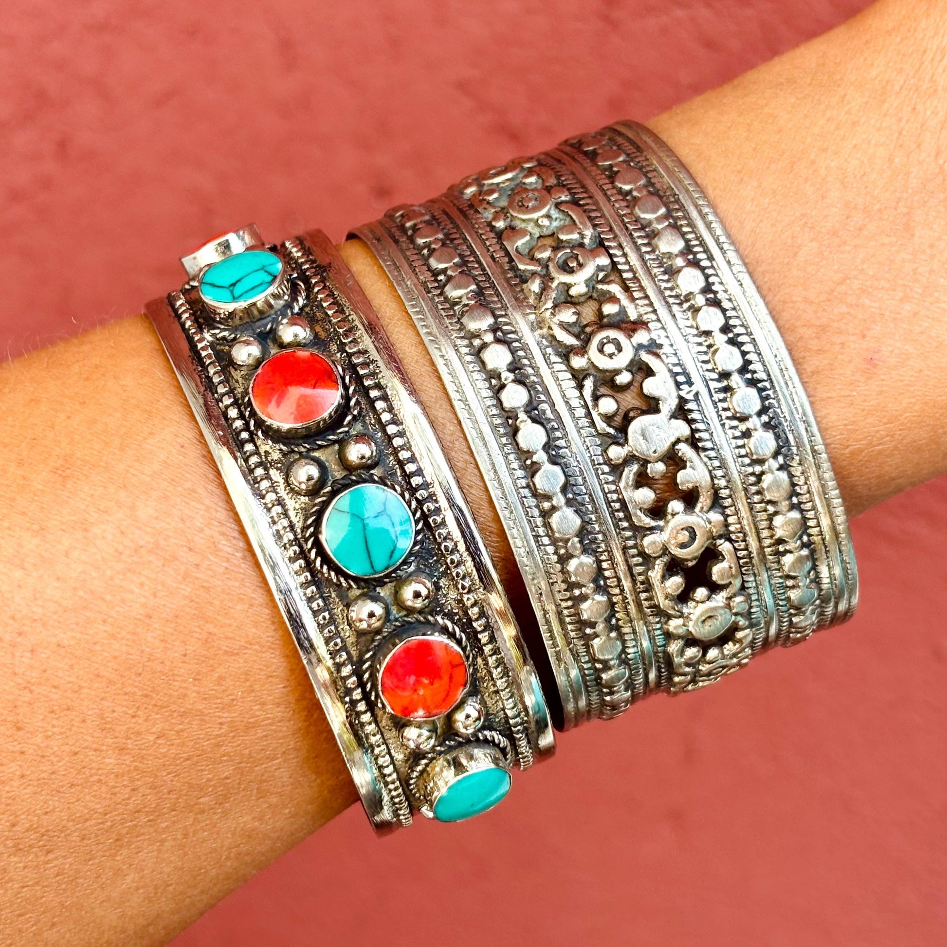 Bracelet Manchette Turkmène Turquoise Corail - Bijou Ethnique Afghan Argent