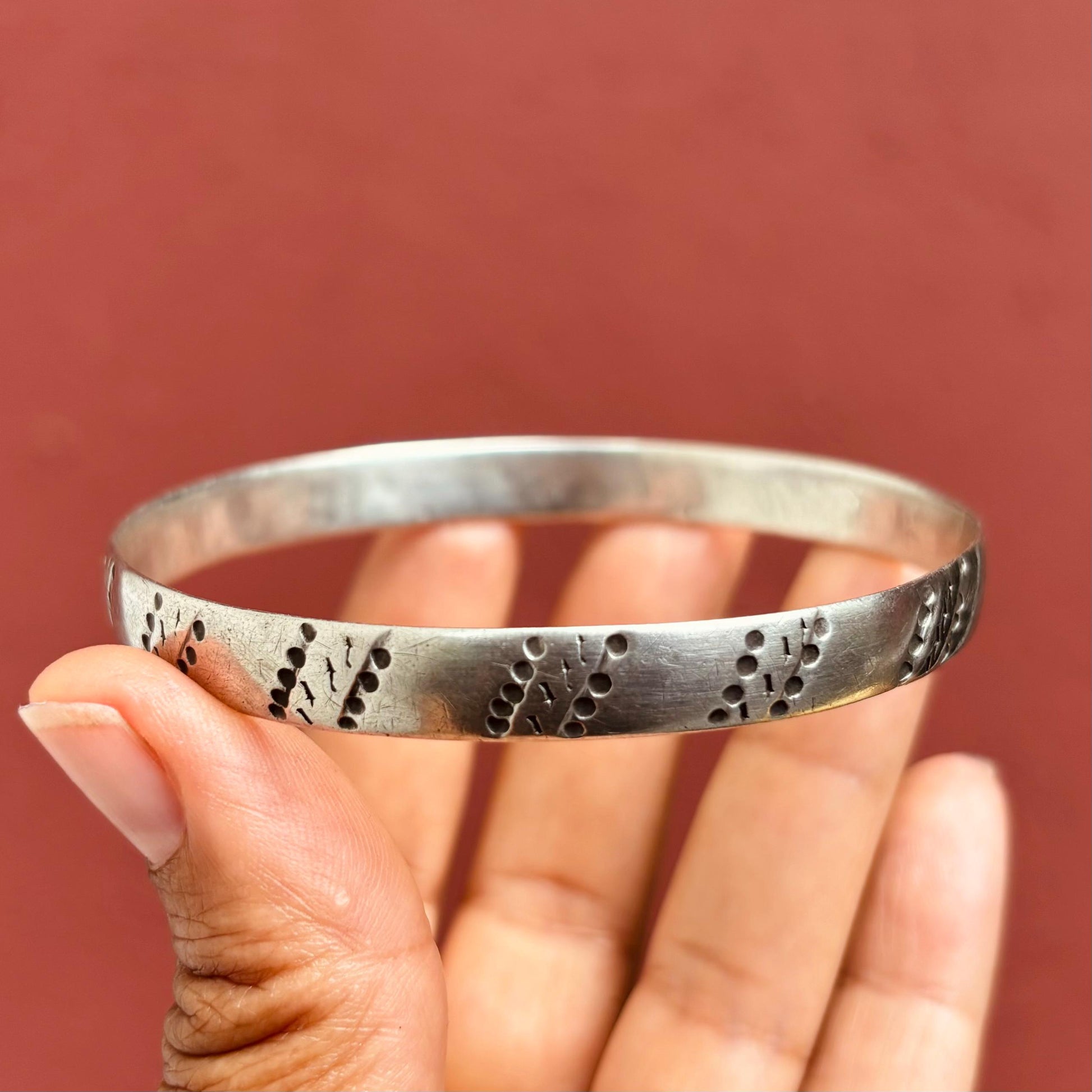 Découvrez ce magnifique bracelet berbère en argent, une pièce authentique ancienne issue de l'artisanat traditionnel du Maroc. Ce bracelet jonc fin et léger au design tribal raffiné incarne la beauté intemporelle des bijoux berbères du Maghreb. Véritable antiquité, ce bijou porte en lui l'histoire et le savoir-faire ancestral des artisans berbères.