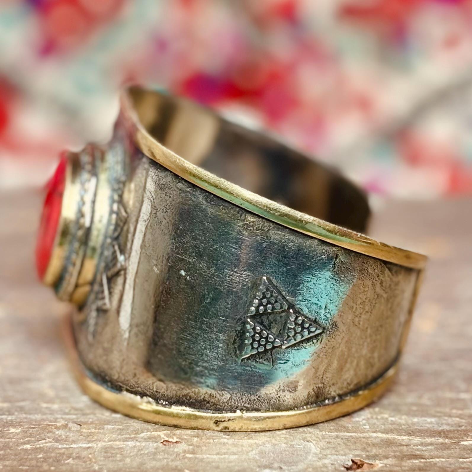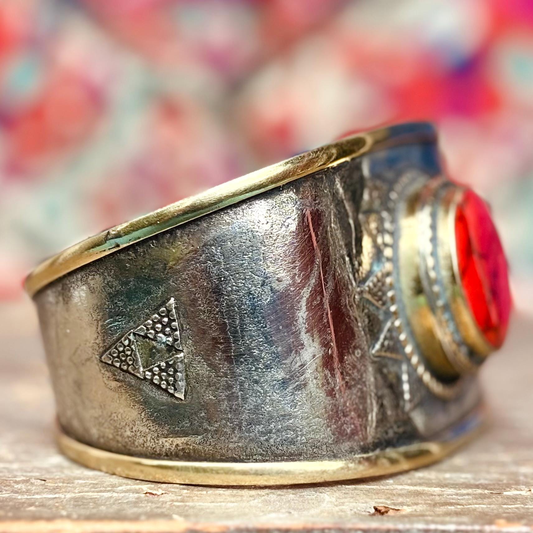 Adoptez ce bracelet manchette argenté boho ethnique pierre rouge et laissez-vous envoûter par la magie des bijoux tribaux d'Asie centrale. Une pièce artisanale en édition limitée qui célèbre l'art, la tradition et la beauté intemporelle d'une couleur passionnée.
