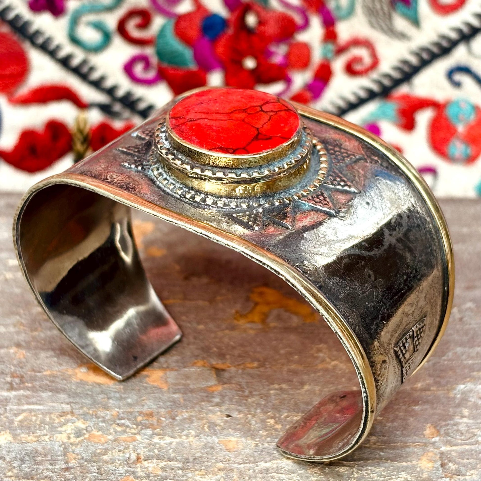 Bracelet manchette argenté boho ethnique pierre rouge - Bijou Turkmène Afghan style bohème oriental