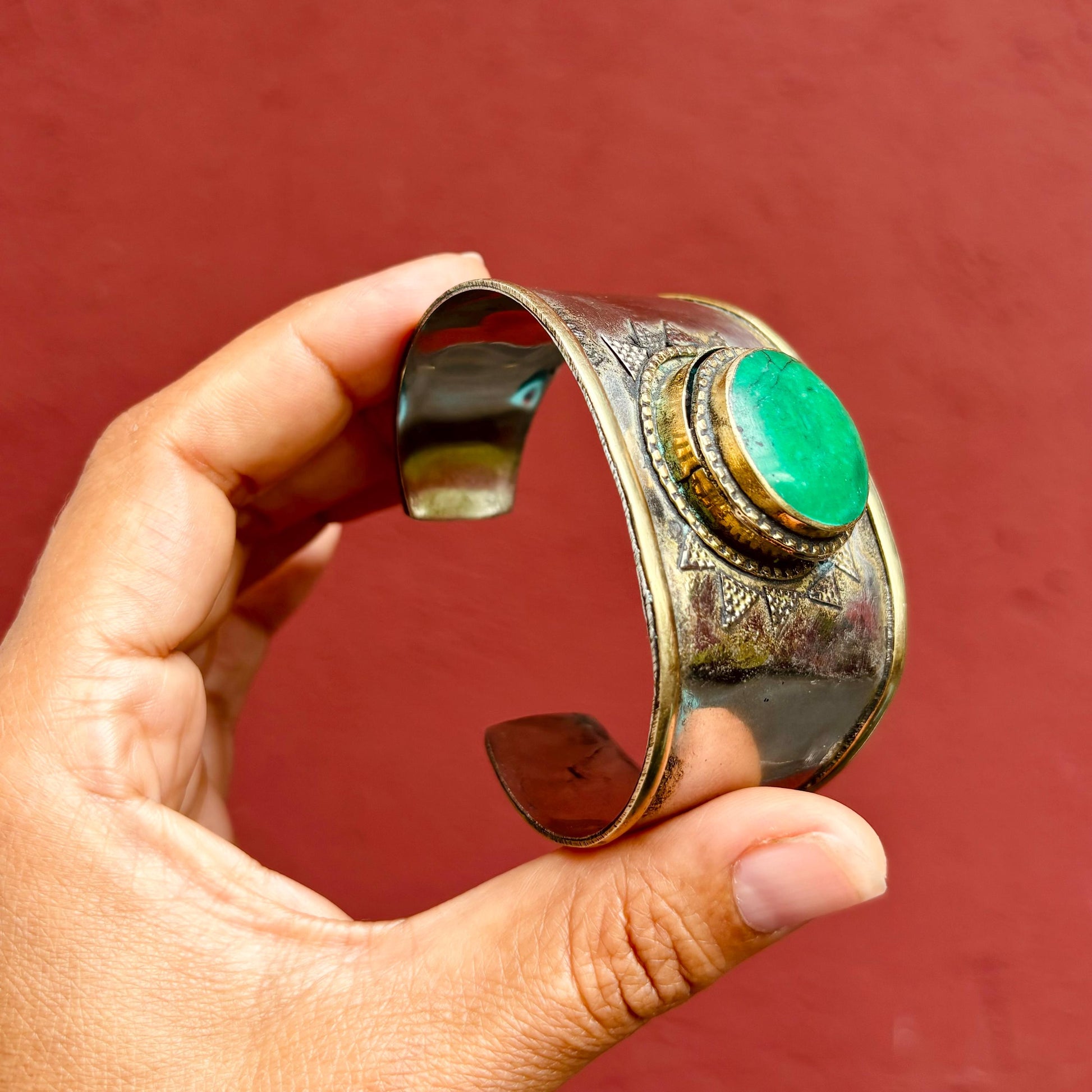 Adoptez ce bracelet manchette afghan vintage en pierre verte et laissez-vous envoûter par la magie des bijoux tribaux d'Asie centrale. Une pièce rare qui célèbre l'art, la nature et la beauté intemporelle.