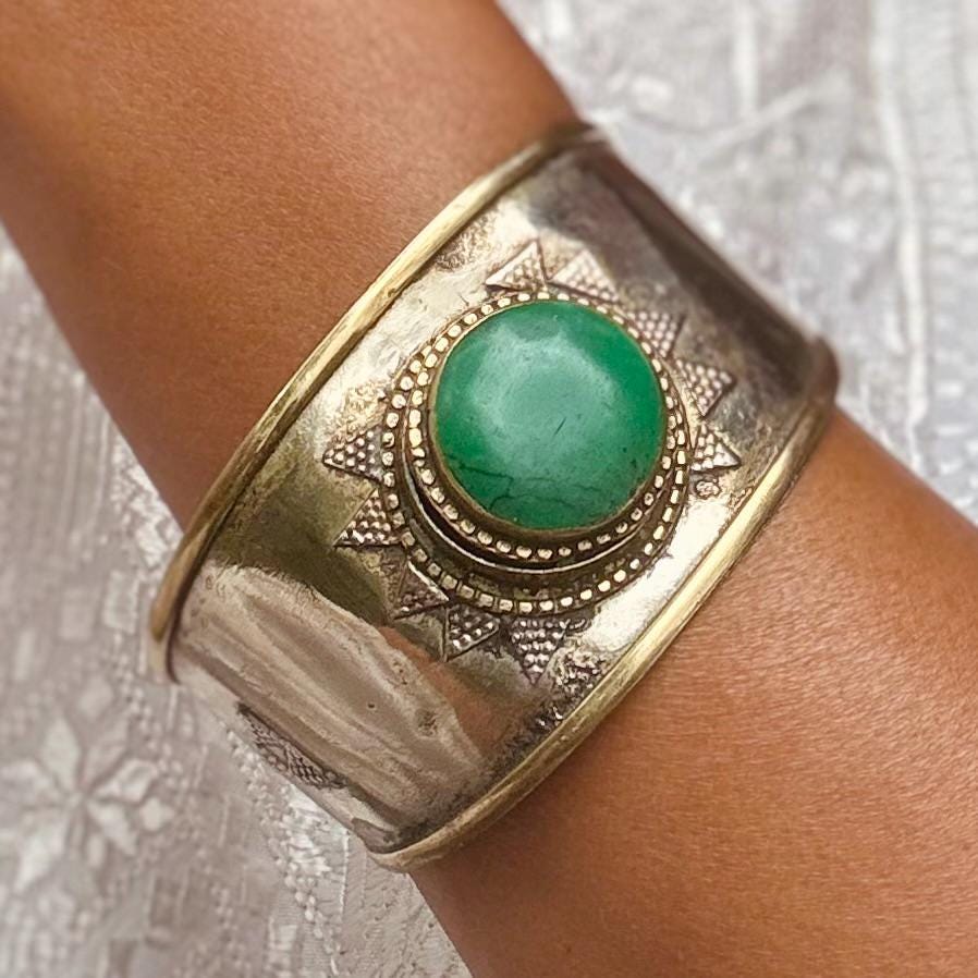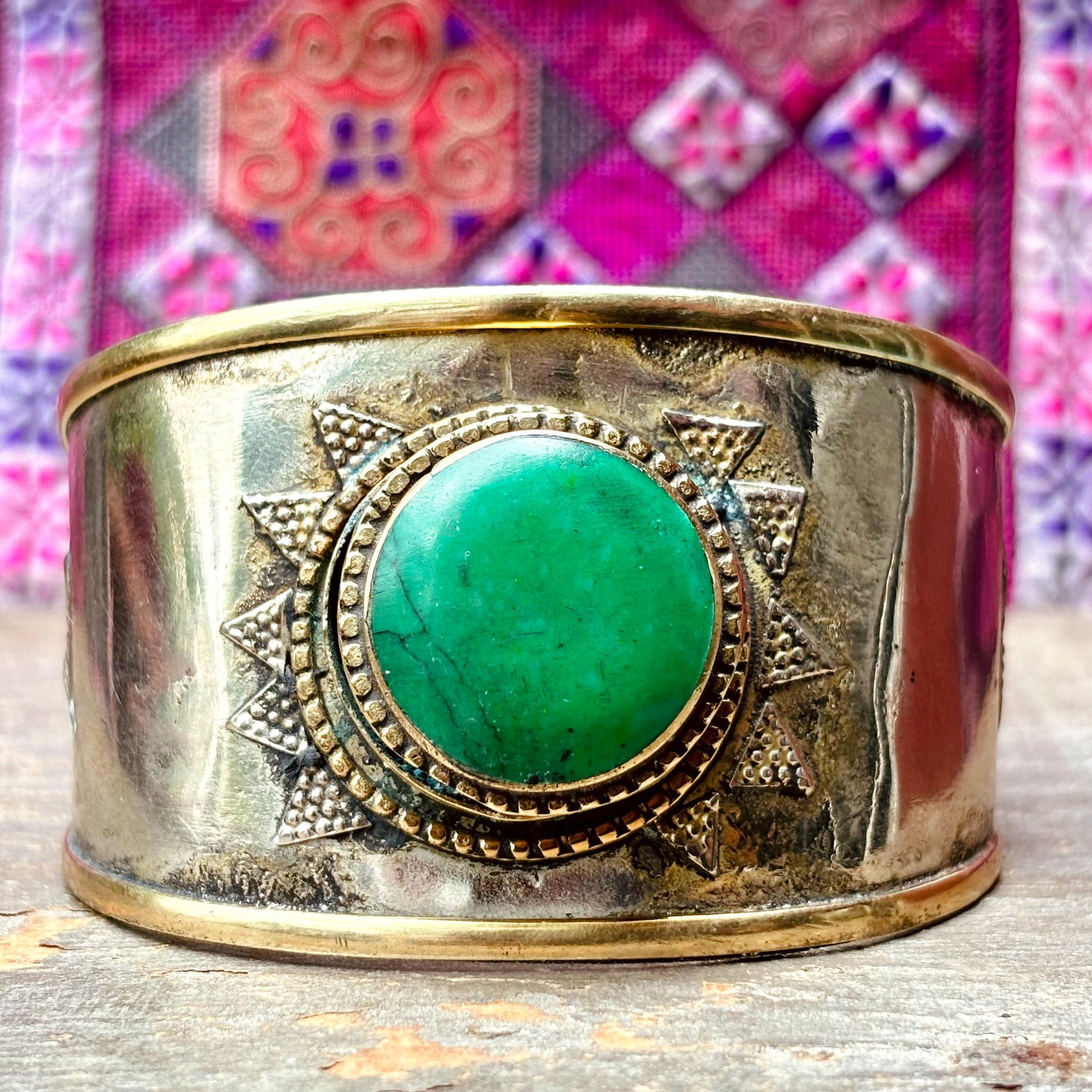 Bracelet manchette rigide pierre verte - Bijou ethnique afghan tribal - Style Boho
