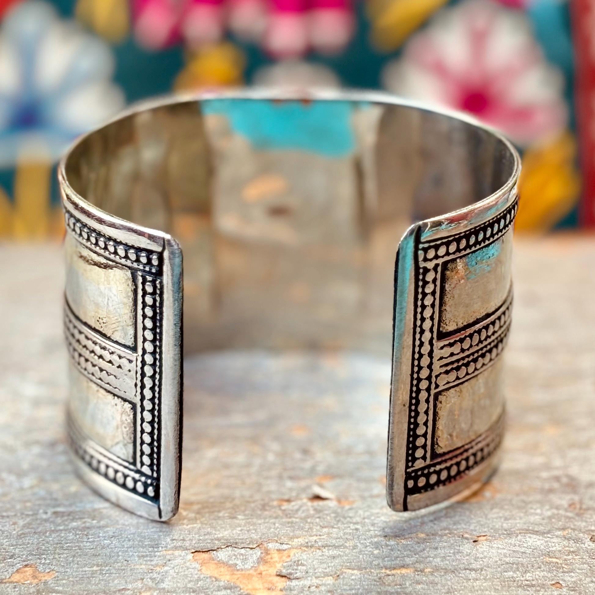 Bracelet manchette rigide agate boho, Bracelet métal argenté pierres cabochon ethnique oriental, Bijou artisanat turkmène, Cadeau pour femme 𖣴 Diamètre bracelet: 65 mm Ouverture bracelet: 30 mm Largeur: 47 mm Poids: 45 gr Bracelet rigide légèrement flexible en métal argenté et agate Provenance: Afghanistan 𖣴 Ce bracelet a été réalisé par un artisan Turkmène. Les Turkmènes sont un peuple de nomades pastoraux d'origine turque, venu d'Asie Centrale et aujourd'hui installés au Turkménistan, dans certaines régions d'Afghanistan, de l'Ouzbékistan, du Kazakhstan et du Caucase. 𖣴 Au-delà de l'aspect purement esthétique des parures et de leur emblème de statut social, les bijoux Turkmènes, transmis de générations en générations, racontent l'identité culturelle, sont chargés de sens symboliques, et de vertus protectrices. 𖣴 Envoi gratuit sécurisé dans toute la France avec numéro de suivi sous 1 à 3 jours ouvrés, emballage soigné 𖣴 VOIR PLUS DE BRACELETS: https://www.etsy.com/shop/TribesNQueens?ref=seller-platform-mcnav§ion_id=36543632 𖣴 Page d'accueil de la boutique TRIBESNQUEENS: https://www.etsy.com/fr/shop/TribesNQueens?ref=shop-header-name&listing_id=1876057210&from_page=listing