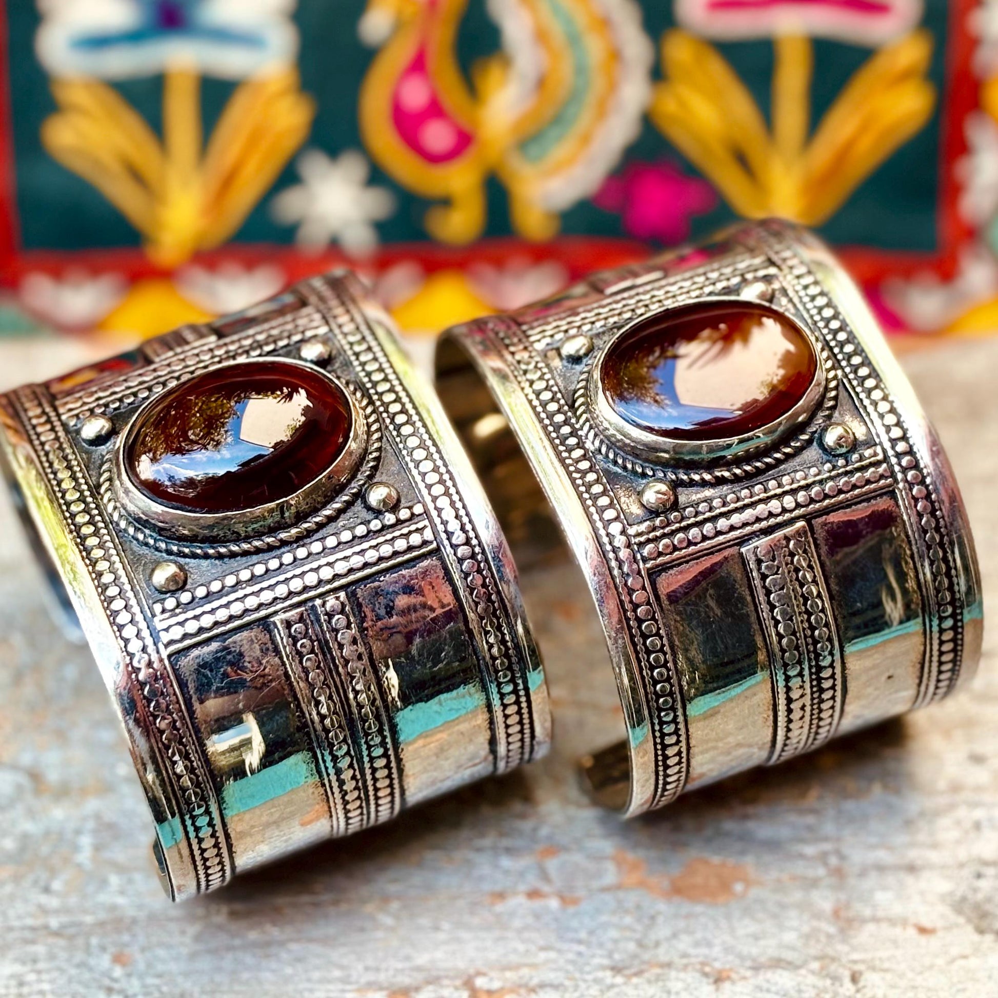 Découvrez ce superbe bracelet manchette rigide orné de pierres d'agate naturelles, une pièce artisanale issue du savoir-faire turkmène d'Asie centrale. Ce bracelet ethnique en métal argenté au design tribal raffiné incarne la rencontre parfaite entre tradition ancestrale et élégance bohème contemporaine.