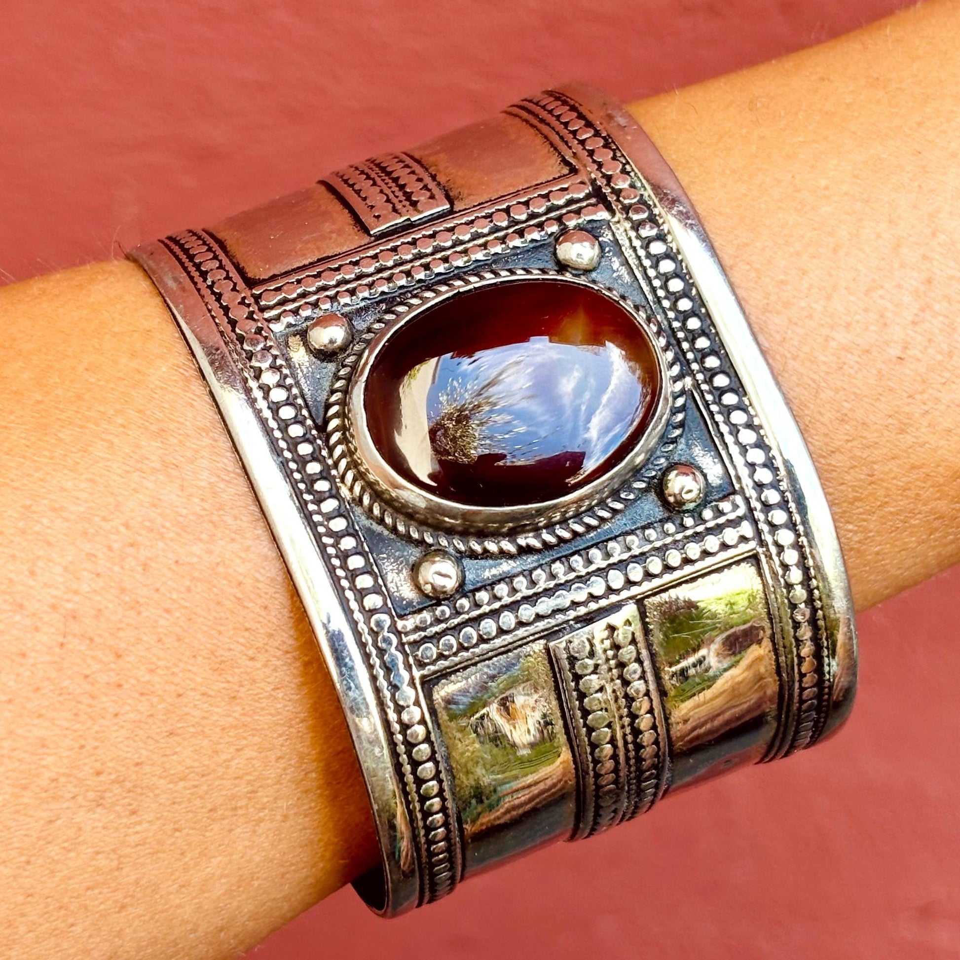 Bracelet manchette rigide agate boho - Bijou ethnique turkmène artisanal