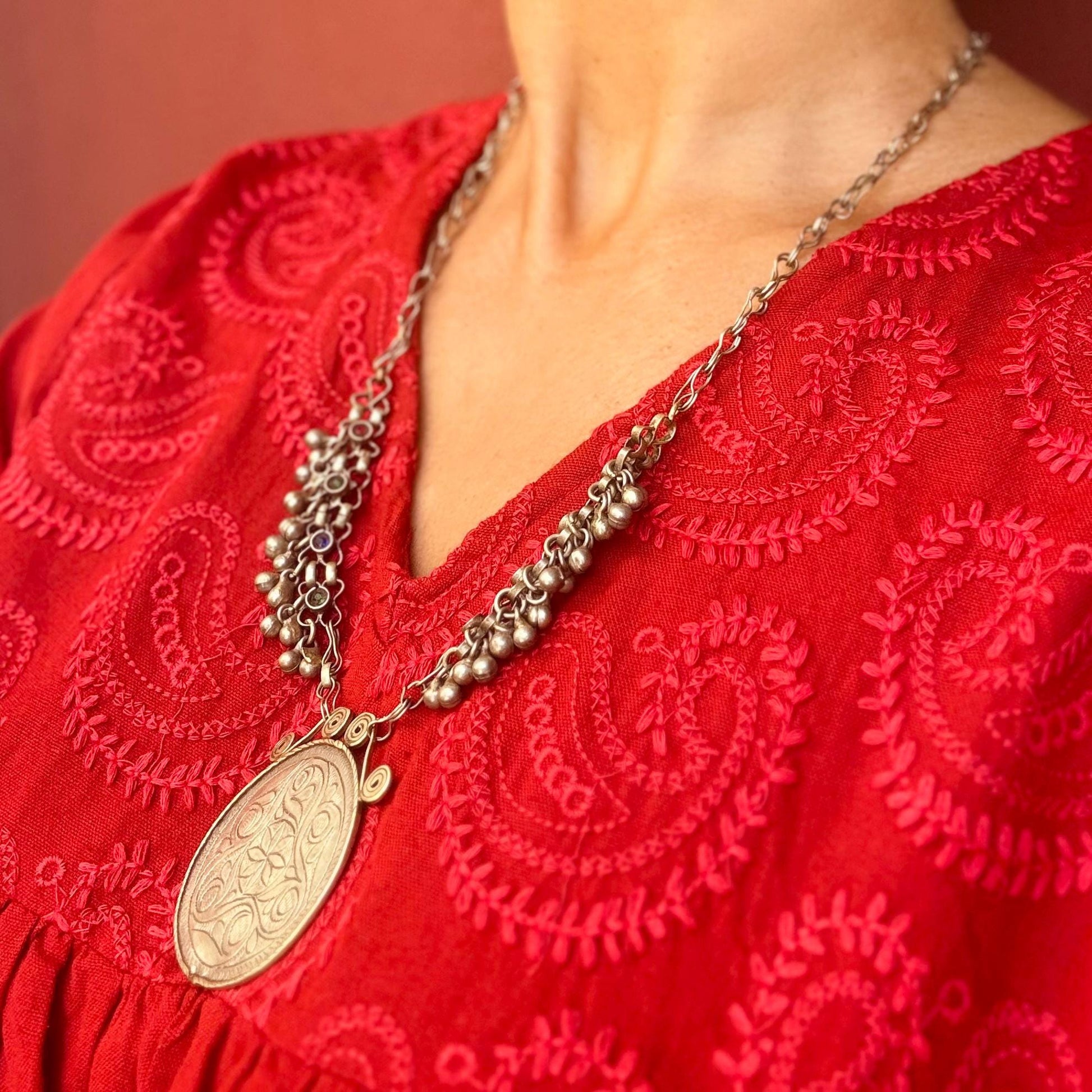 Collier breloques pendentif rond boho tribal, Collier afghan vintage tribu nomade, Collier long oriental ethnique hippie, Cadeau pour femme
