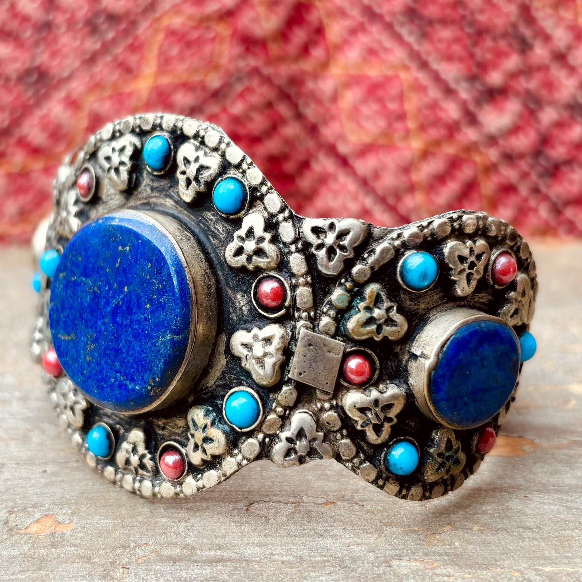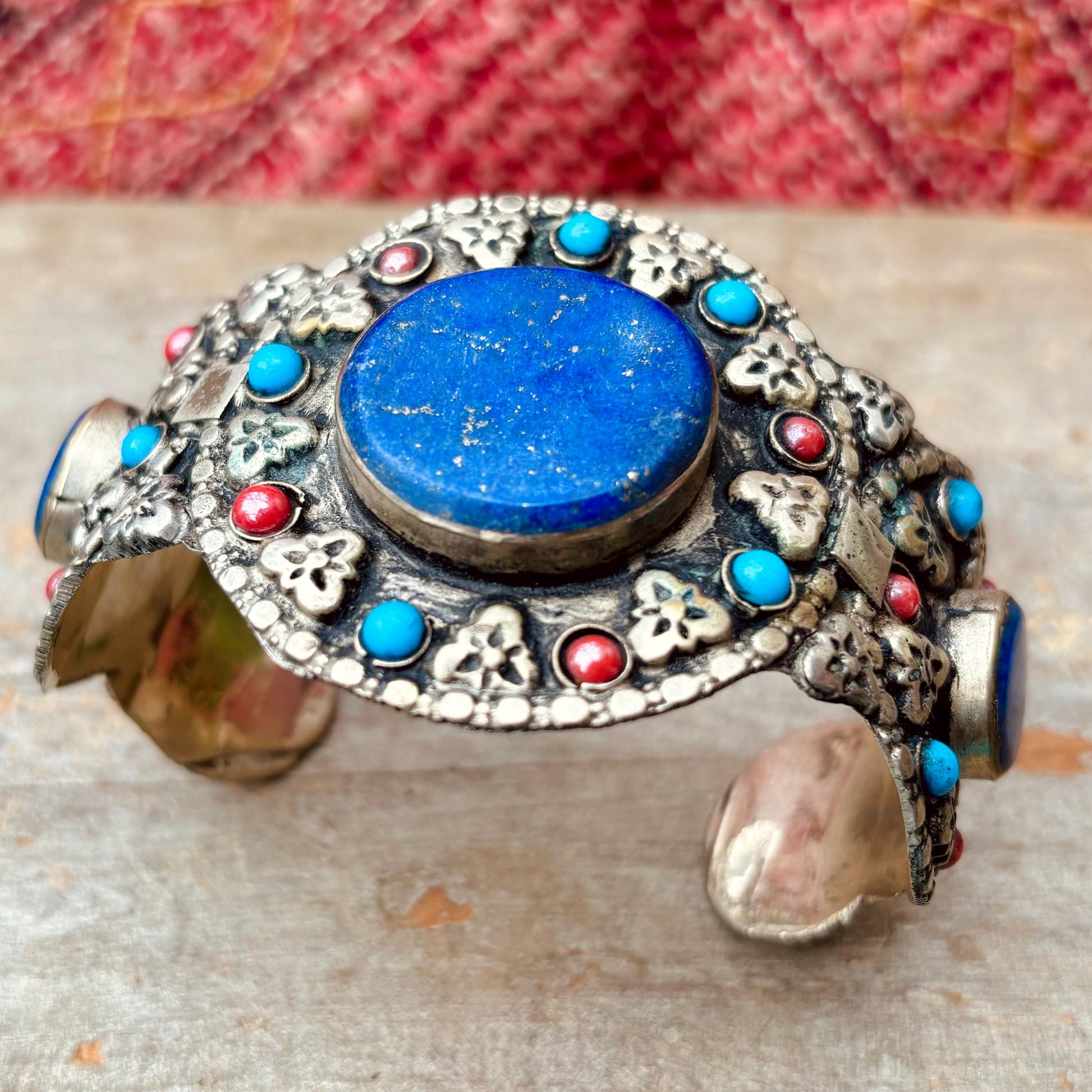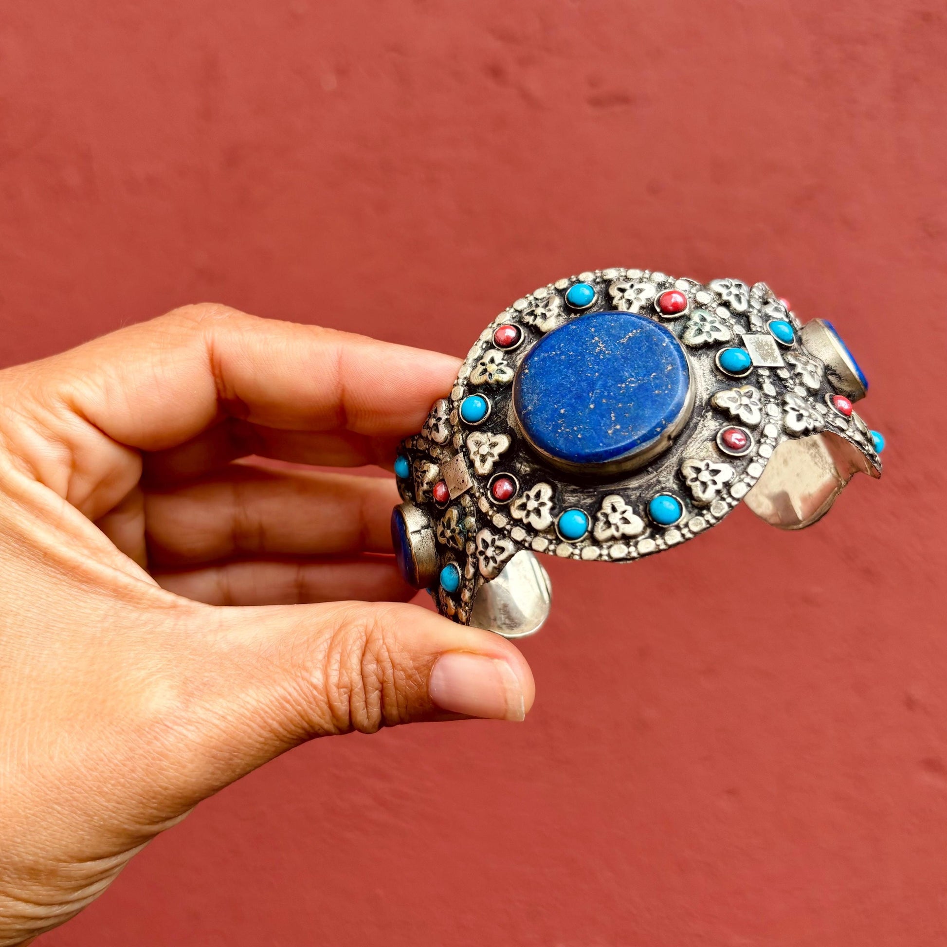 Adoptez ce bracelet manchette turkmène en lapis-lazuli et laissez-vous envoûter par la magie des bijoux tribaux d'Asie centrale. Une pièce artisanale qui célèbre l'art, la nature et la beauté intemporelle d'une pierre royale millénaire.