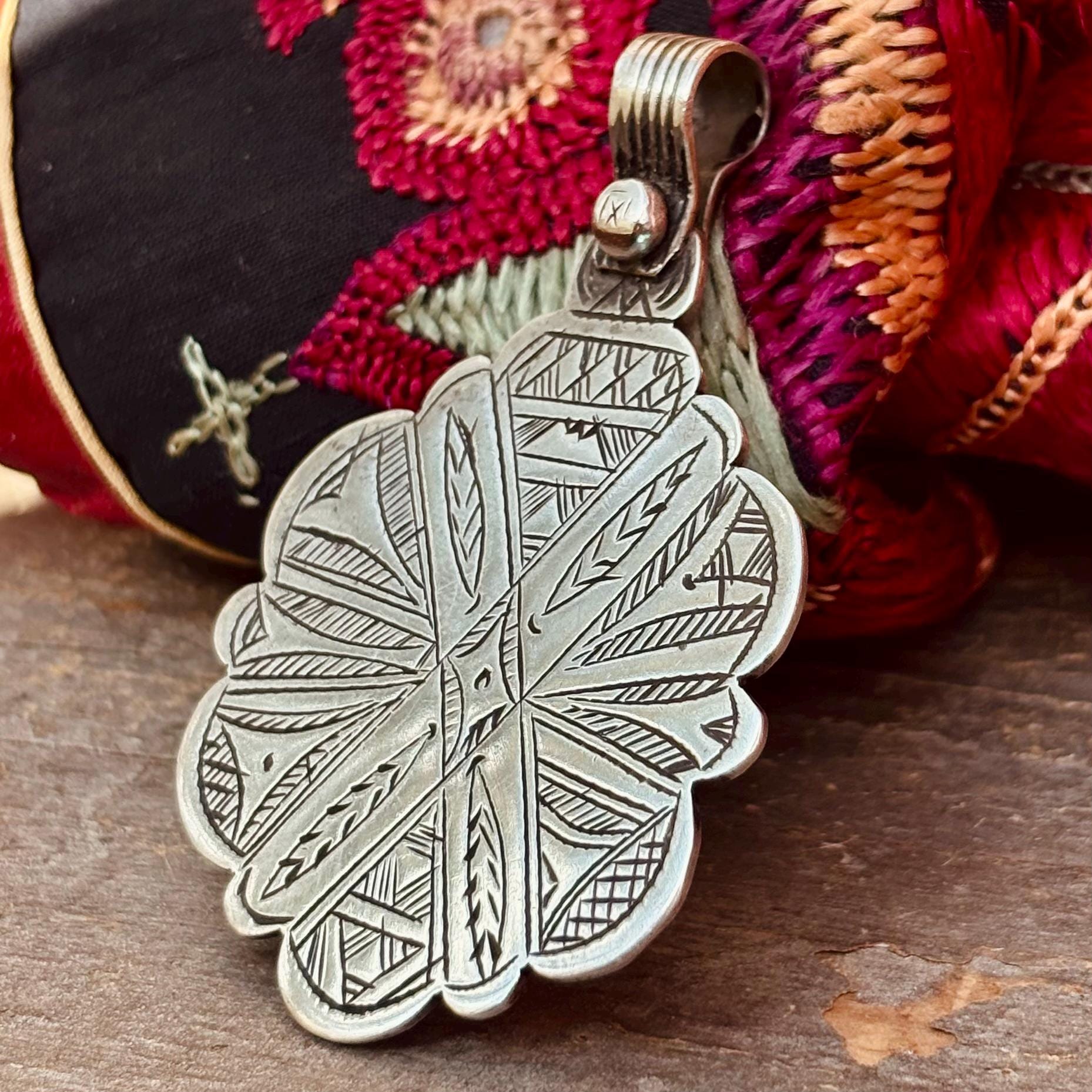 ✨ Pendentif Berbère argent gravé Maroc - Amulette tribale orientale ancienne