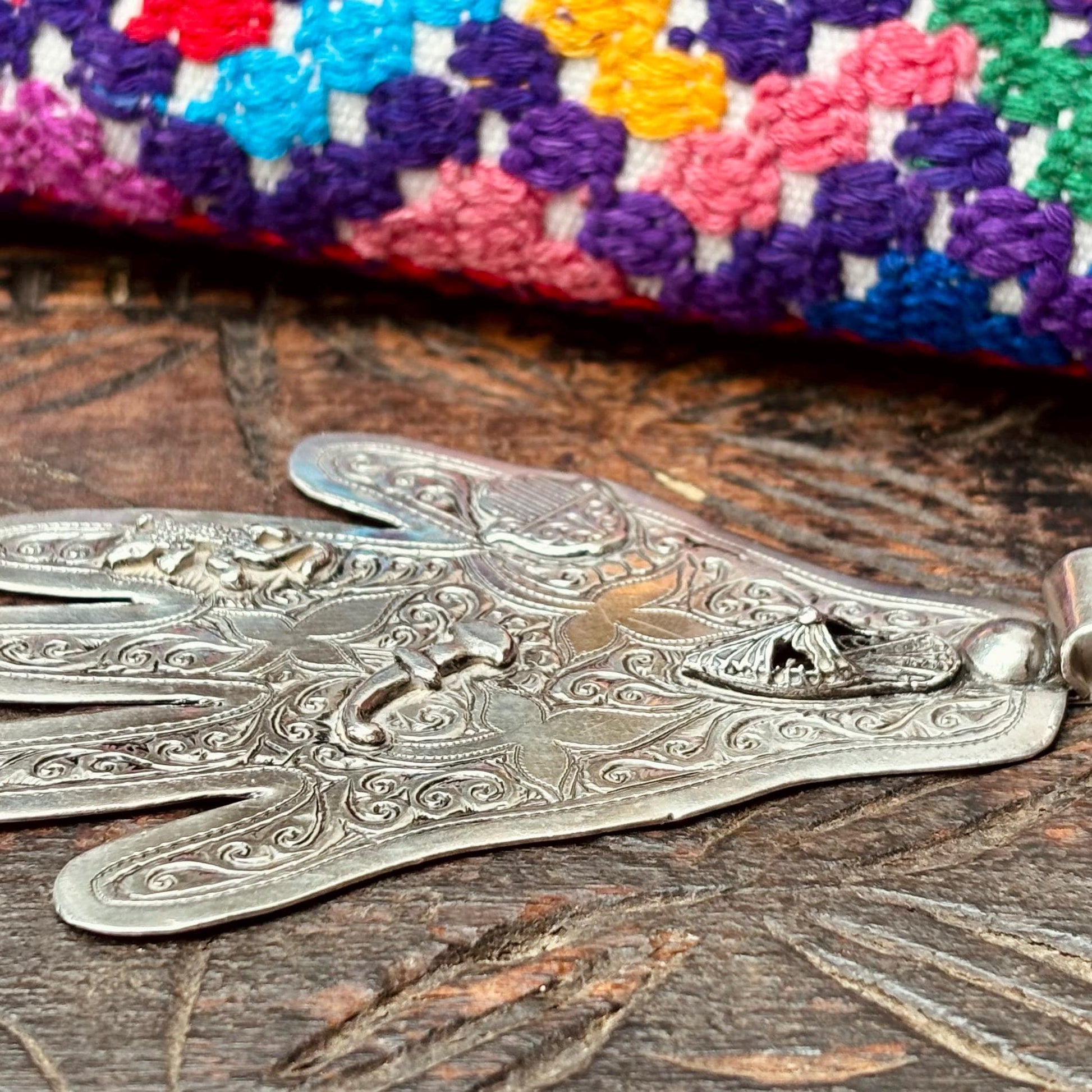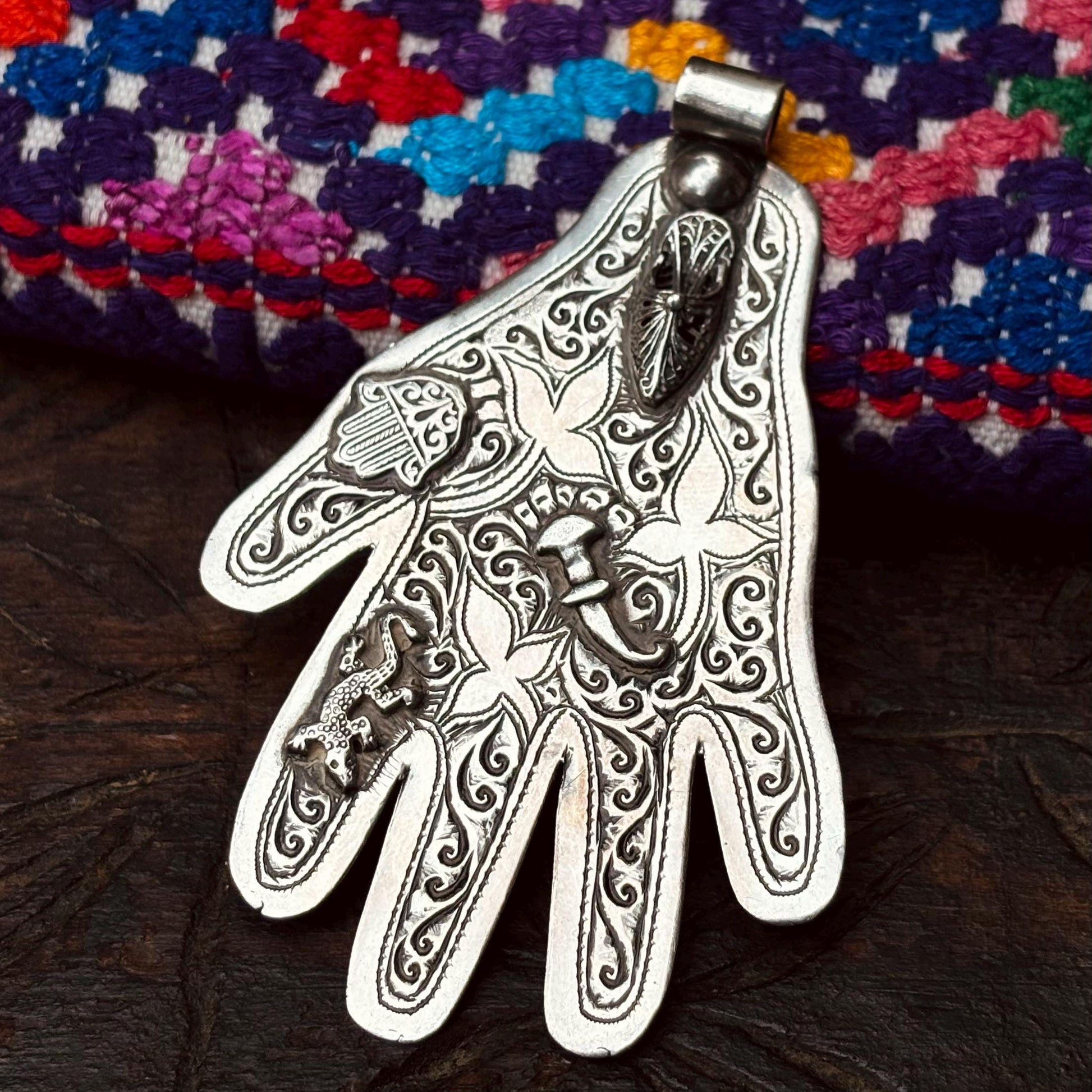 Découvrez ce superbe grand pendentif ancien berbère en argent 900/1000 poinçonné, provenant du Maroc. Ce bijou artisanal rare et exceptionnel représente la Hamsa (Main de Fatima), symbole de protection universel dans la culture amazighe, ornée d'une salamandre mystique - une combinaison rarissime chargée de puissance symbolique.