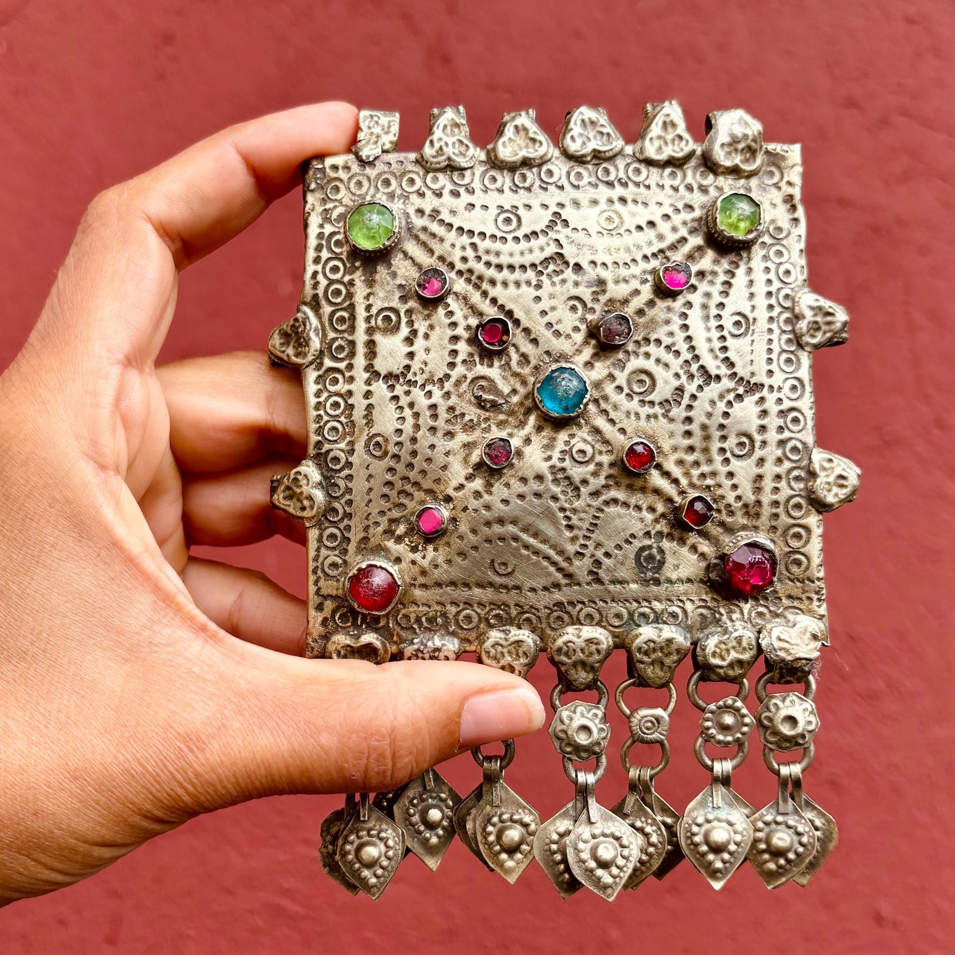 Adoptez ce pendentif tribal ethnique carré gravé afghan et laissez-vous transporter par la magie des bijoux d'Asie centrale. Une pièce d'exception pour une femme d'exception, un trésor nomade qui raconte l'histoire des routes de la soie, des tribus du désert et de l'artisanat ancestral. Que vous soyez danseuse, festivalière, bohème dans l'âme ou simplement amoureuse des bijoux chargés d'histoire, ce pendentif deviendra votre talisman préféré, un compagnon qui vous protège et vous inspire.