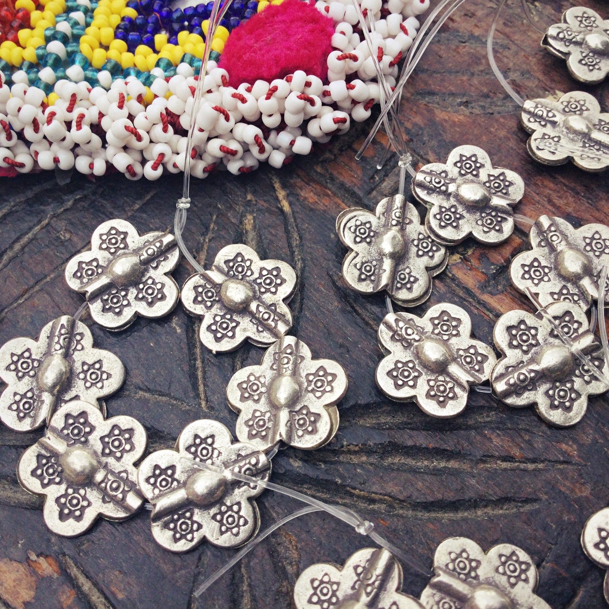 Perles fleur argent Thaïlande, Perles vintage tribu Karen, Perles tribales ethniques vintage, Fournitures création fabrication bijoux