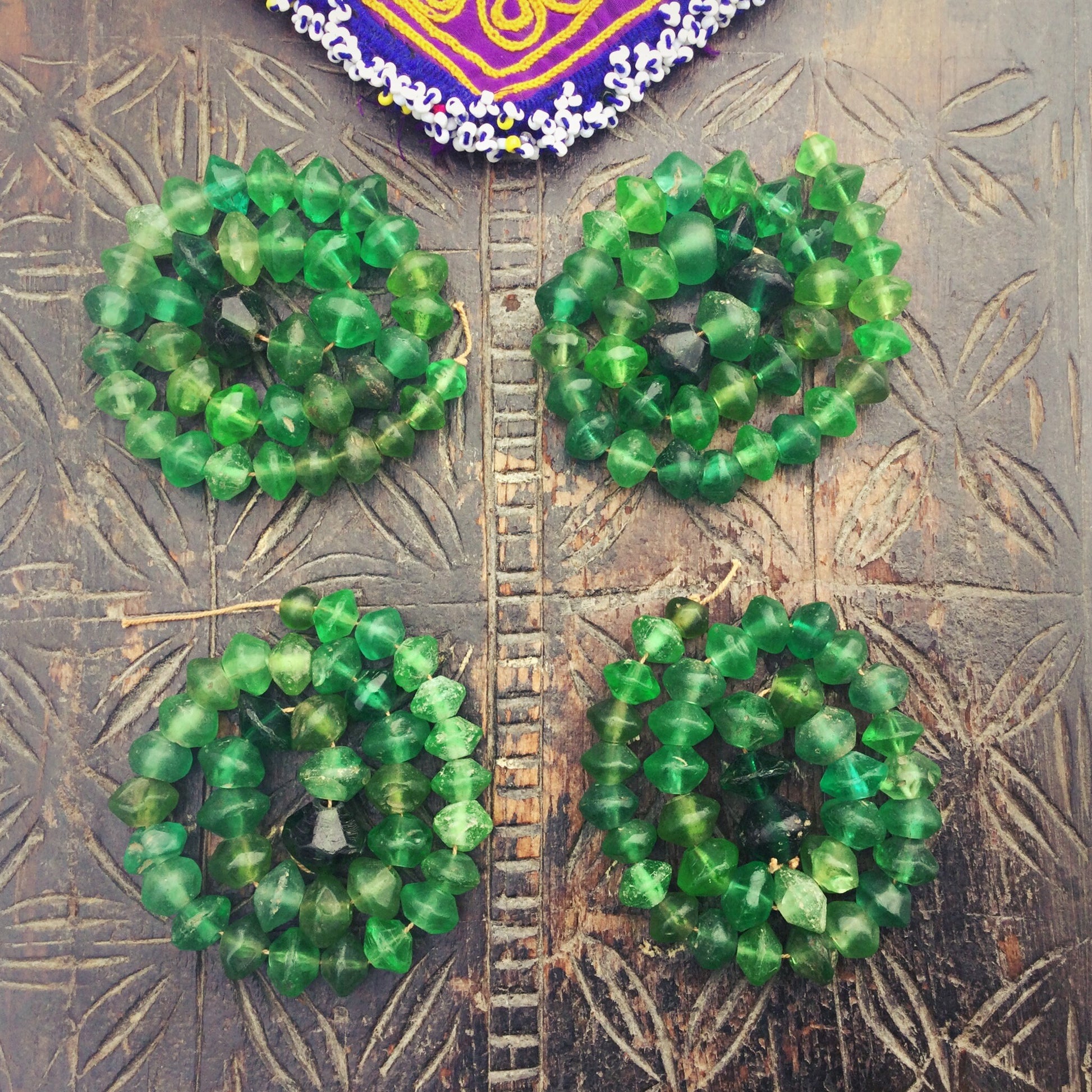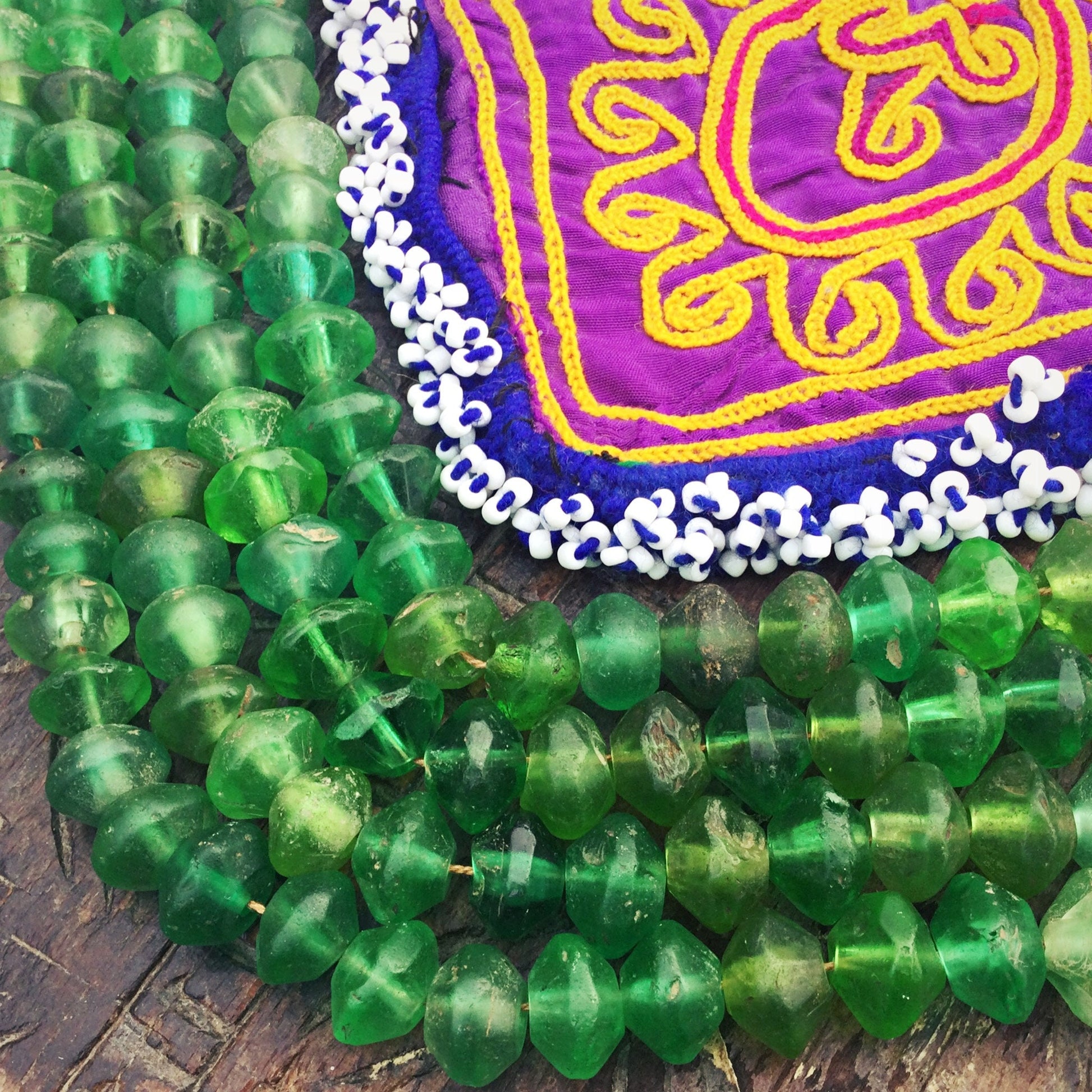 Vieilles perles de commerce vert émeraude, Perles antiques icône verre de Bohême, Perles anciennes africaines vaseline translucide vintage